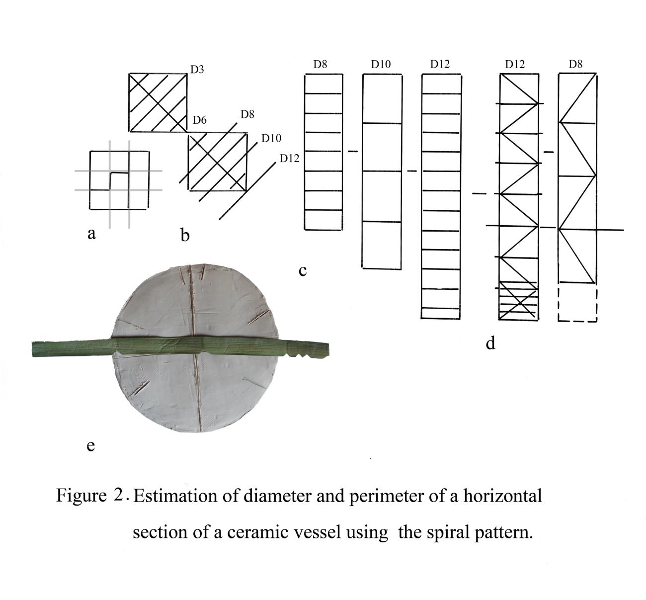 With regards to the ceramic ornamentation, there are questions as to the type of measuring tools used and the counting system employed. There are a limited number of variables applied in the crafting of a particular ceramic vessel: for example, the height of the walls, the diameter, and the perimeter of a horizontal section (See Figure 1). It is possible to hypothesize that this ancient decorative technique can be reconstructed based on application of the formalized image of the spiral in one and a half turns as a basic tool (see also Lamina 2008).