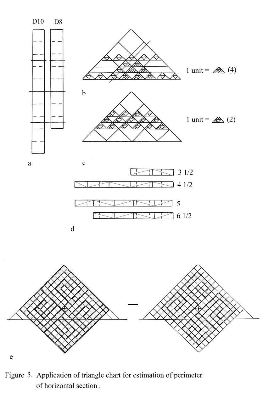 The diagonal which is passing through the center of the spiral pattern consists of six parts (See Figure 2b), whereas practically the diameter of the section may be presented conveniently with eight parts (See Figure 2b). The graphic extension of sides of the pattern on the plan up to twelve parts shows that the actual diameter is now possible to present as one consisting of ten parts (See Figure 2b). The consecutive proportional extension of the initial diameter (D8) can done in three steps: (1) an increase of initial diameter up to ten parts (D10), (2) return the value back to eight parts; and (3) an extension of diagonal up to ten parts again (D12) (See Figure 2c). The resulting length (12.5 parts of initial diameter) with an insignificant error is equal to half of perimeter of the horizontal section (See Figure 2e), whereas potentially the perimeter can be estimated as consisting of 100 parts.