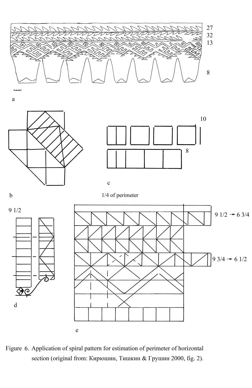 Meander décor and triangle chart designs are intimately connected to each other in the ornamental schemes attributed to the Andronovo (Fedorovo) culture (Бобров& Михайлов1989). It can be assumed that the meander décor performed on the triangle net with center settled on the line six and a half may reduce the proportion of empiricism in measurements, providing relevant markers were used (See Figure 5e).