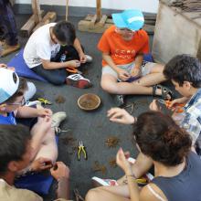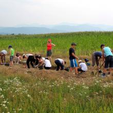 The camp program was divided by days, in order to be as varied and well organized as possible. The first day was dedicated to the activities of the "Little Archaeologist" workshop. Children, accompanied by four teachers (Dorin Motohon, Ionca Vasile, Diana Moţ, and Iuliana Mitrache) and five archaeologists (Sorana Ardeleanu, Ancuţa Bobînă, Dan Pop, Bogdan Bobînă, and Marius Ardeleanu), went for a day trip to the Bozânta Mică-Grind archaeological site and learnt activities related to the archaeologist profession. The children were first presented with, and then experienced for themselves, methods of identifying, investigating and documenting an archaeological site: the children took part in a field surface survey on the archaeological site, conducted an archaeological systematic research and then documented, through photography and drawing, archaeological ceramics discovered by them (See Figure 1). They were also thought about the later stages of archaeological research of the pieces discovered: pottery conservation and storage.