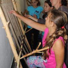 The vertical loom workshop, after antique models (See Figure 4), was held at the Museum on the third day of activities and included an overview of the history of wool yarn from sheep's wool to the finished shirt. An explanation of all the methods of production, preparation, and processing of the wool thread was presented, then, students had the opportunity to test the work at four vertical looms (antique type). Also, fragments of fabric made on the vertical looms were sewn and bound with woollen girdles made by them. In parallel with this, the chain-mail knitting workshop, where they made fragments of chain-mail out of iron wire, and the workshop where replicas of ancient military and civilian equipment were tested, were held (See Figure 5).