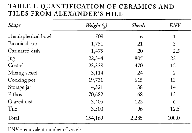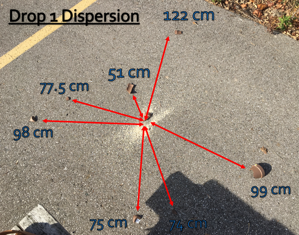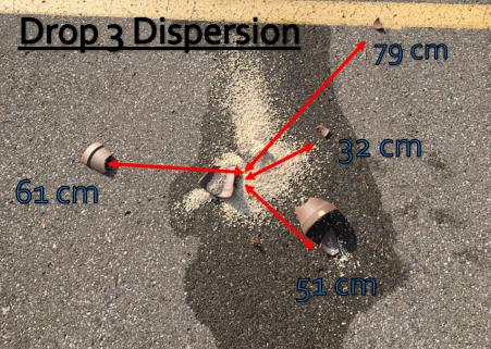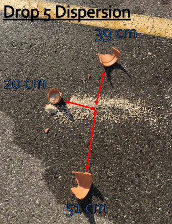 The distribution of sherds from the point of impact followed a specific pattern. Typically, it was found that smaller sherds (small and medium) were concentrated at the point of impact whereas larger sherds (large and extra-large) fell at a greater radius from the centre point.