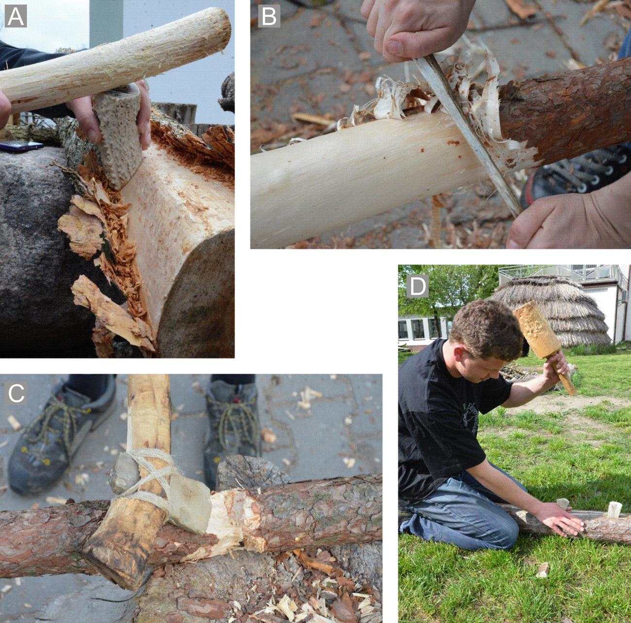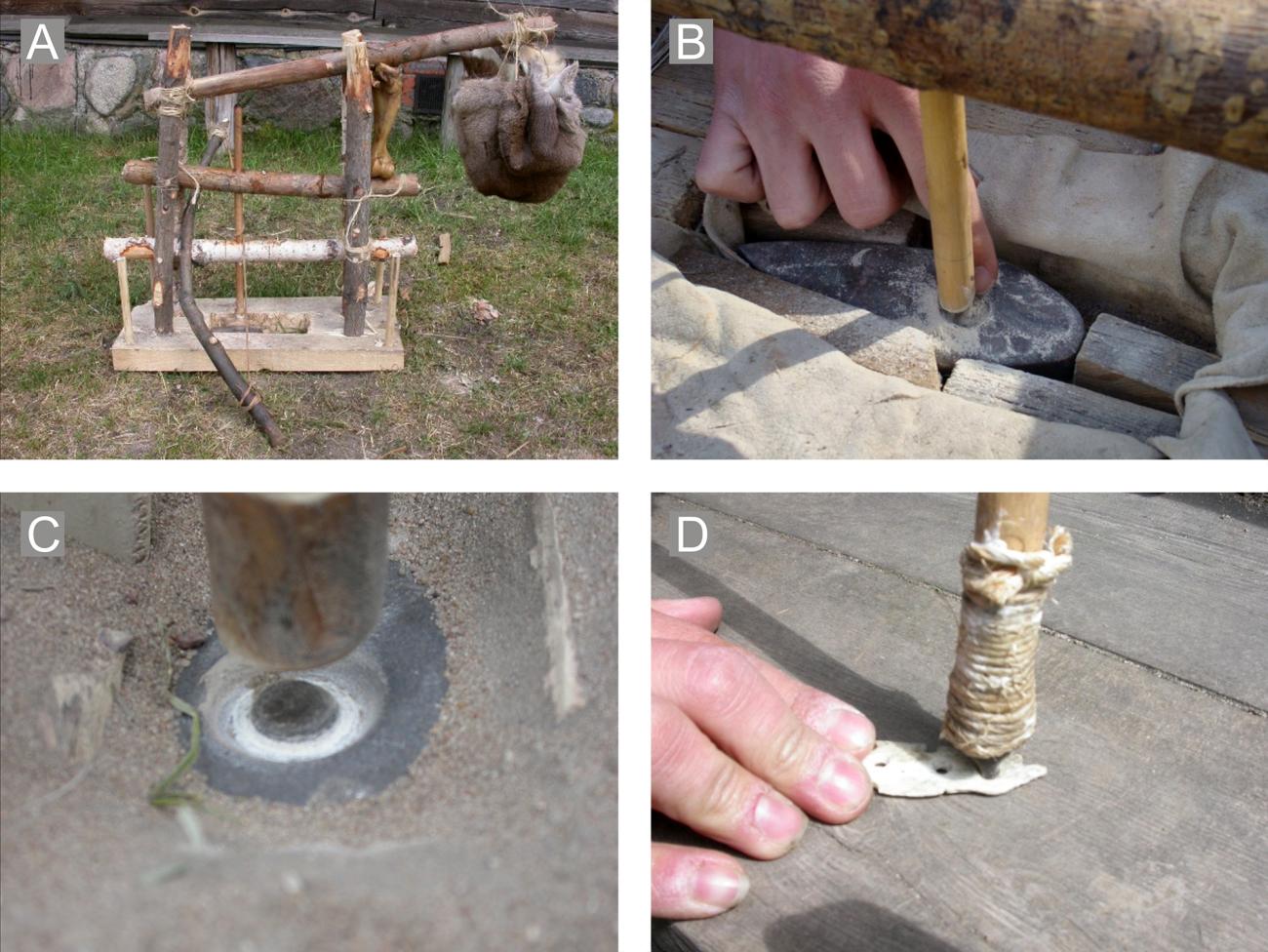 Another aspect of SEPA activities related to the processing of osseous raw materials are the experiments with prehistoric techniques of drilling. Within the range of artefacts encountered by the Stone Age researchers, one may distinguish those with characteristic, large (over 1.5 cm) holes. Upper-Palaeolithic bâtons de commandement, Mesolithic shafts and mattocks, or Neolithic T-shaped axes are only some examples of this type of artefacts found at various archaeological sites (Kempisty, 1961; Newcomer, 1976; Bagniewski, 1992; Płonka 2003). Holes visible on prehistoric artefacts often have different longitudinal sections, which may suggest differences in the techniques used to make them.