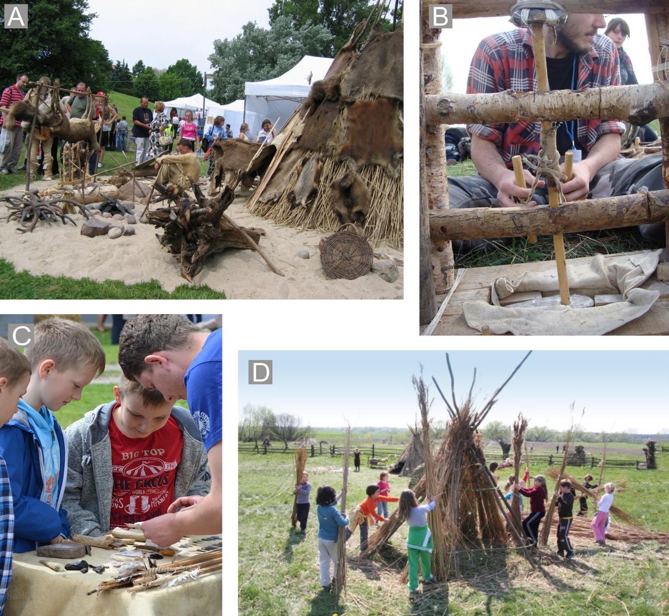 One of the important aspects of SEPA activities is the popularisation and outreach aspect of archaeology, experimental archaeology concerning the Stone Age. Students belonging to the society organise numerous presentations and archaeological workshops, which are addressed both to the young and the adults (See Figure 12). During such events, the audience has the opportunity to get acquainted with techniques used for treatment of various materials and tool production in prehistoric times. Presentations include, among others, hole drilling in organic (antler, bone) and inorganic (stone) materials, flint knapping, amber working, pottery burning and tar production with non-ceramic or ceramic methods. The most important goal of these workshops is to promote learning through experience, thus the greatest emphasis is put on encouraging the visitors to get involved in the activities as much as possible. Anyone interested may try their hand at working with replicas of different types of tools, for example drilling different substances with hand drillers, cutting grass with sickles with flint blades or wood chopping with flint and antler axes. It is also a chance to learn hand potting, bow shooting, hide tanning, painting with natural pigments, and erecting a provisional hut. Participants also discover the secrets and flavours of the Stone Age food. Presentations of this type are organised by SEPA members as parts of archaeological festivals which take place across the country. The Society actively collaborates with local governments, public benefit organisations and associations, as well as schools and museums throughout Poland. Past events include the Long Night of Museums or the Science and Art Festival, organised by the Nicolaus Copernicus University in Toruń.
