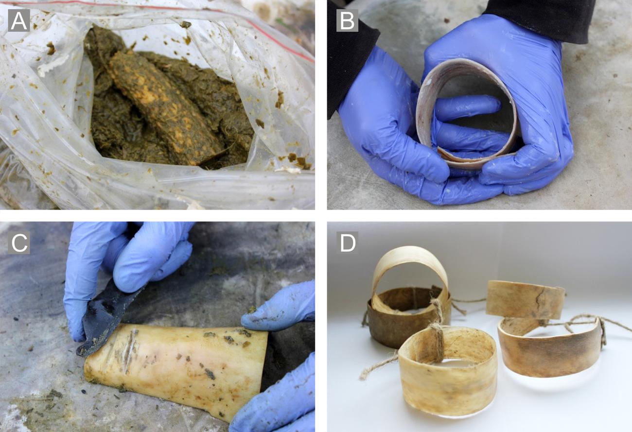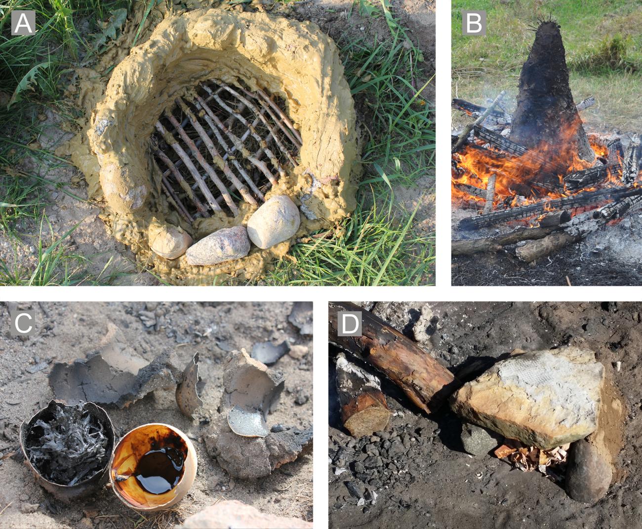 Methods of birch tar production without the use of ceramics has been investigated by many researchers (Todtenhaupt, Elsweilerand Baumer, 2007; Palmer, 2007; Hirzel, 2008; Todtenhauptand Pietsch, 2011; Kurzweiland Weiner, 2013). Relevant experiments carried out recently by the members of SEPA have been aimed at seeking for an effective method of birch bark pyrolysis, which would leave no archaeologically recognisable traces of smelting kilns (See Figure 2). Various types and variants of kiln structures are tested: closed-hearth stone kilns lined with sandy clay, open-hearth stone kilns, kilns made of wattle covered with silt, as well as kilns made of empty goose egg shells, which is a particular imitation of the two-vessel method. Moreover, methods for separating tar from impurities by means of various filters made of grass, hide, wattle, stones, sand, bark, etc. while still firing are also investigated (Osipowicz,et al.,2017). Research conducted so far include analyses of the properties of the binder, obtained experimentally, and its chemical composition in the context of similarities and differences from archaeologically acquired prehistoric substances, as well as the possibility of distinction from a product obtained with the use of the “ceramic methods.” Preliminary results indicate that it is not possible to distinguish tar produced using the developed non-ceramic (single-container) method from a substance obtained with the employment of the two-vessel method, based on the applied so far ATR-FTIR spectral analyses. However, it should be noted that the currently conducted experiments, which make use of other, non-standard methods, suggest that this could be a possibility.