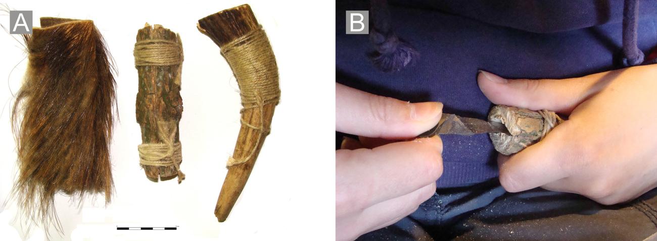 SEPA’s experimental project concerning this subject has already been completed. The research consisted of three parts. First, in a series of experiments, flint flakes were repeatedly placed in and taken out of sheaths made of wild boar leather, antler, and wood (See Figure 4). The second part of the project was focused on traces occurring as a result of the tool’s contact with the surface of its fitting during usage (handles were made from the same materials as the mentioned sheaths). The final stage of the project comprised carrying flint flakes in various containers made of chamois leather, bone, and wood for several months. Currently, laboratory experiments aimed at microscopic analysis of use-wear traces occurring as a result of all the mentioned activities are underway. However, already at this point it can be observed that such processes have an enormous impact on the state of a flint’s surface and the characteristics of use-wear traces formed on the working edges.