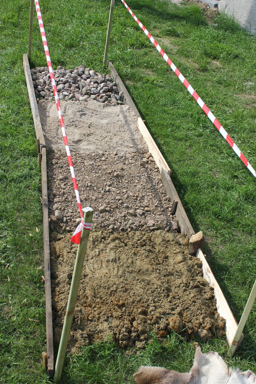 Another type of experiment realised by the SEPA members has been connected with the so-called trampling. The studies are aimed at the analysis and interpretation of the post-depositional damage occurring on flint and stone tools during the process of intense treading (Shea and Klenck, 1993). Their character depends on the type and chemical composition of the soil, water presence, treading intensity, and landform. For the purpose of an experiment carried out by SEPA, a path framed in wood, 1 m wide and 4 m long, consisting of four equal sectors, was built (See Figure 5). Each of the sectors was filled with a different material: sand, gravel, stone, and clay. Three types of flint (Baltic, chocolate, and świeciechowski) and one stone material (red quartz porphyry) were employed. A specific number of flakes of a given material were located in each sector of the path. The experiment’s time span was planned for three months, admitting daily usage of the path. The flakes utilised in this experiment are currently being subjected to traceological analysis. Already, some considerable significance of this experiment’s impact on the interpretation of the origin of the so-called micro-scrapers, found on many Mesolithic sites in Poland, can be claimed (Osipowicz, 2010, 2017).