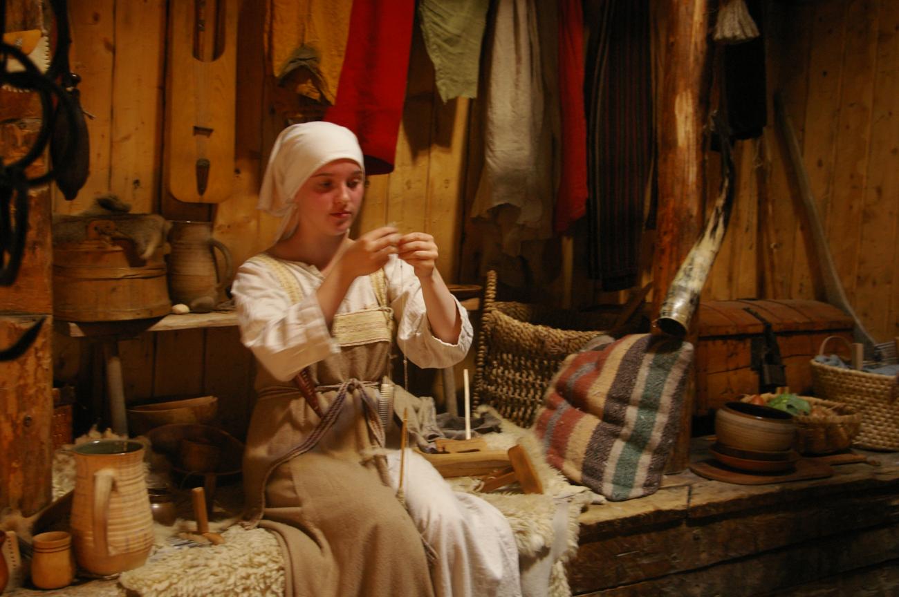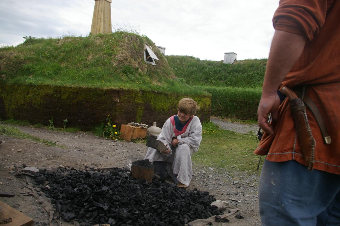 Kate Burnham (a DARC veteran at 15!) came into her own this year representing a young adult's activities, including textiles, food preparation, and child control. She also spent time teaching the runes, wool preparation and spinning to anyone who was interested - Parks Canada staff and visitors alike. A good portion of her time was spent helping other DARC members and Parks Canada staff with their tasks – delivering snacks, meals, and water (both for consumption and for general use). This is her third visit to the site, having been with DARC during the 2010 and 2012 trips. Now that Liam and Kieran are around the same age that she was on previous trips, she can compare her younger self to them (and vice versa), behavior and all. She found interpreting the site to younger or teenaged audiences much easier because she was of a similar age and could refer to their typical daily activities.She often found herself explaining her chores to visitors and how the chores would compare to a boy's of the same age, or younger children.