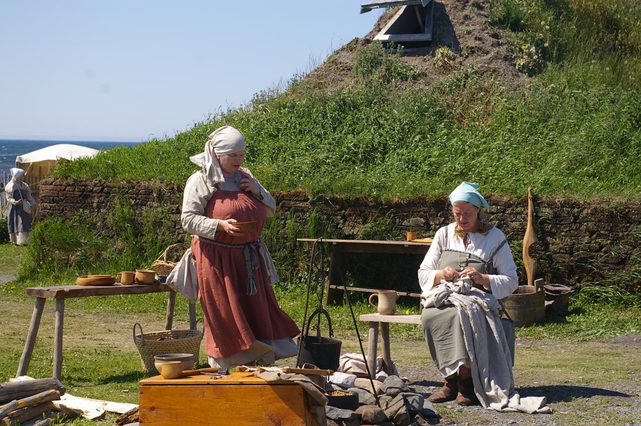 Lying at the extreme northern tip of Newfoundland, L'Anse aux Meadows represents the only widely accepted Viking-Era presence in North America. Archaeological remains of seven buildings were found at the site, along with a few minor artefacts including a ring-headed pin, glass bead, and drop-spindle whorl. Evidence of on-site work was also found in the form of iron slag, discarded ship rivets, and axe-hewn wood chips. Four of the seven buildings were reconstructed by Parks Canada. Since 1997, these have been staffed by costumed interpreters who blend first- and third-person styles to tell the story of the Viking-Era Scandinavian presence in North America.