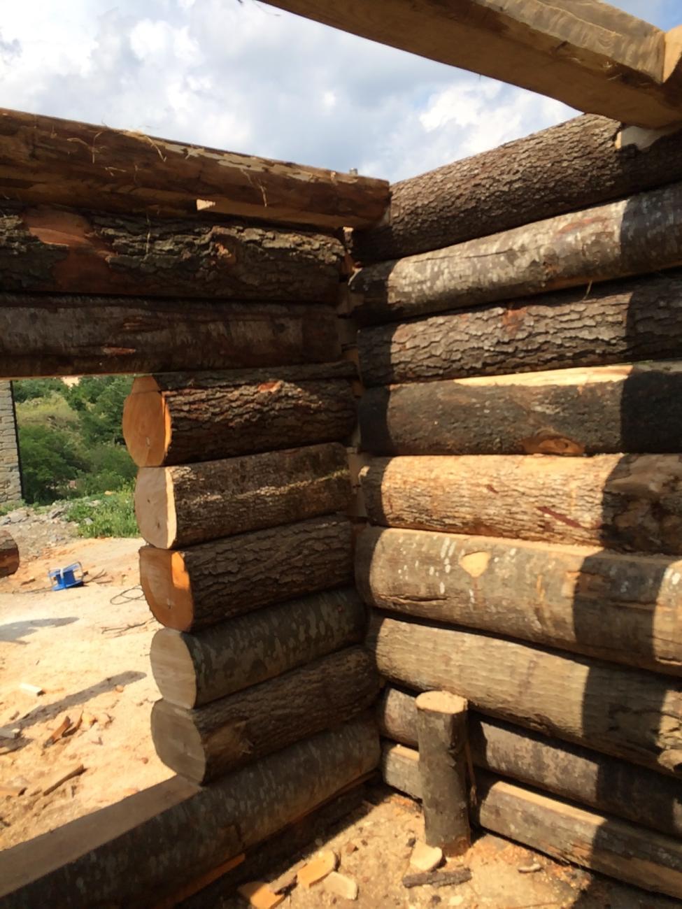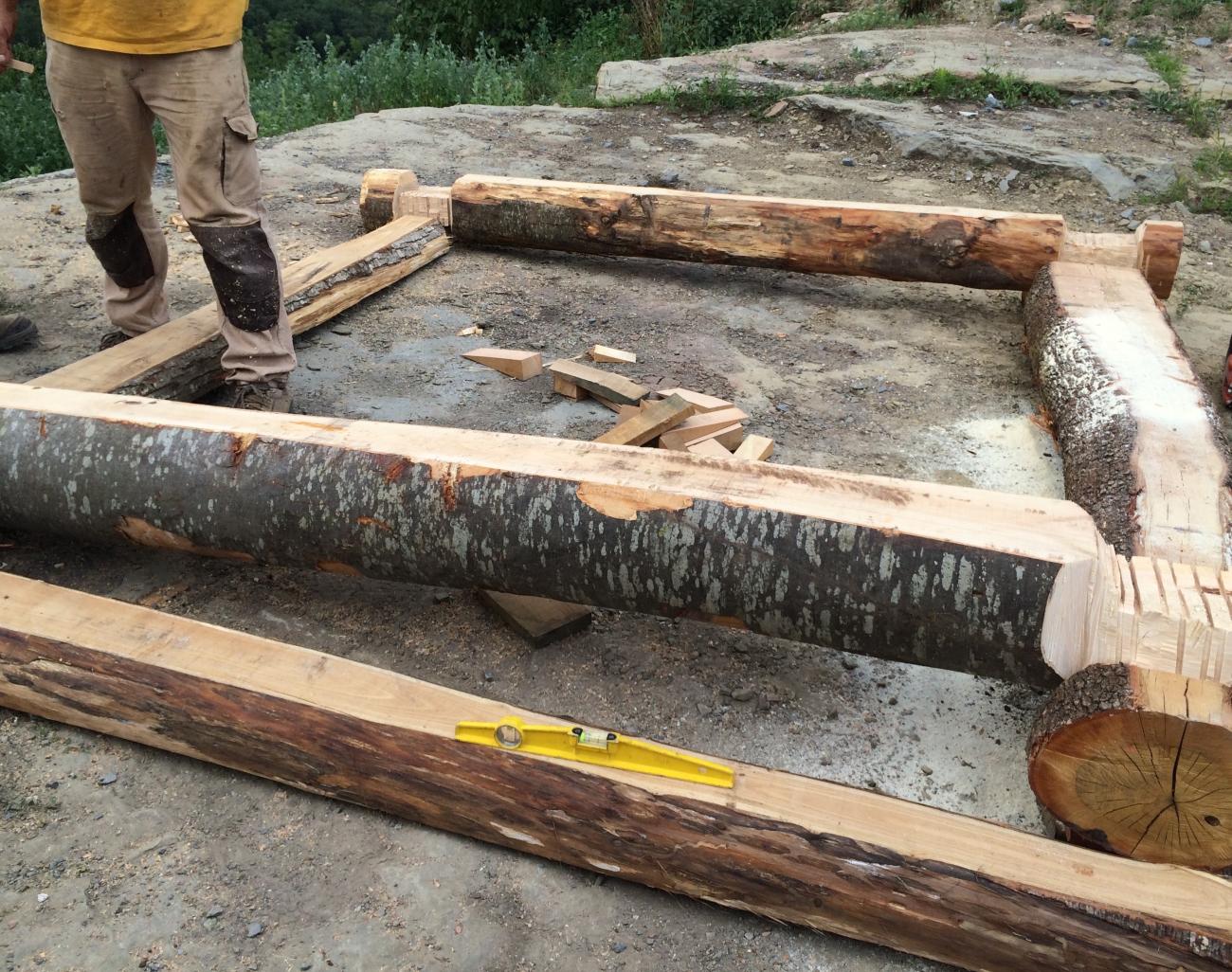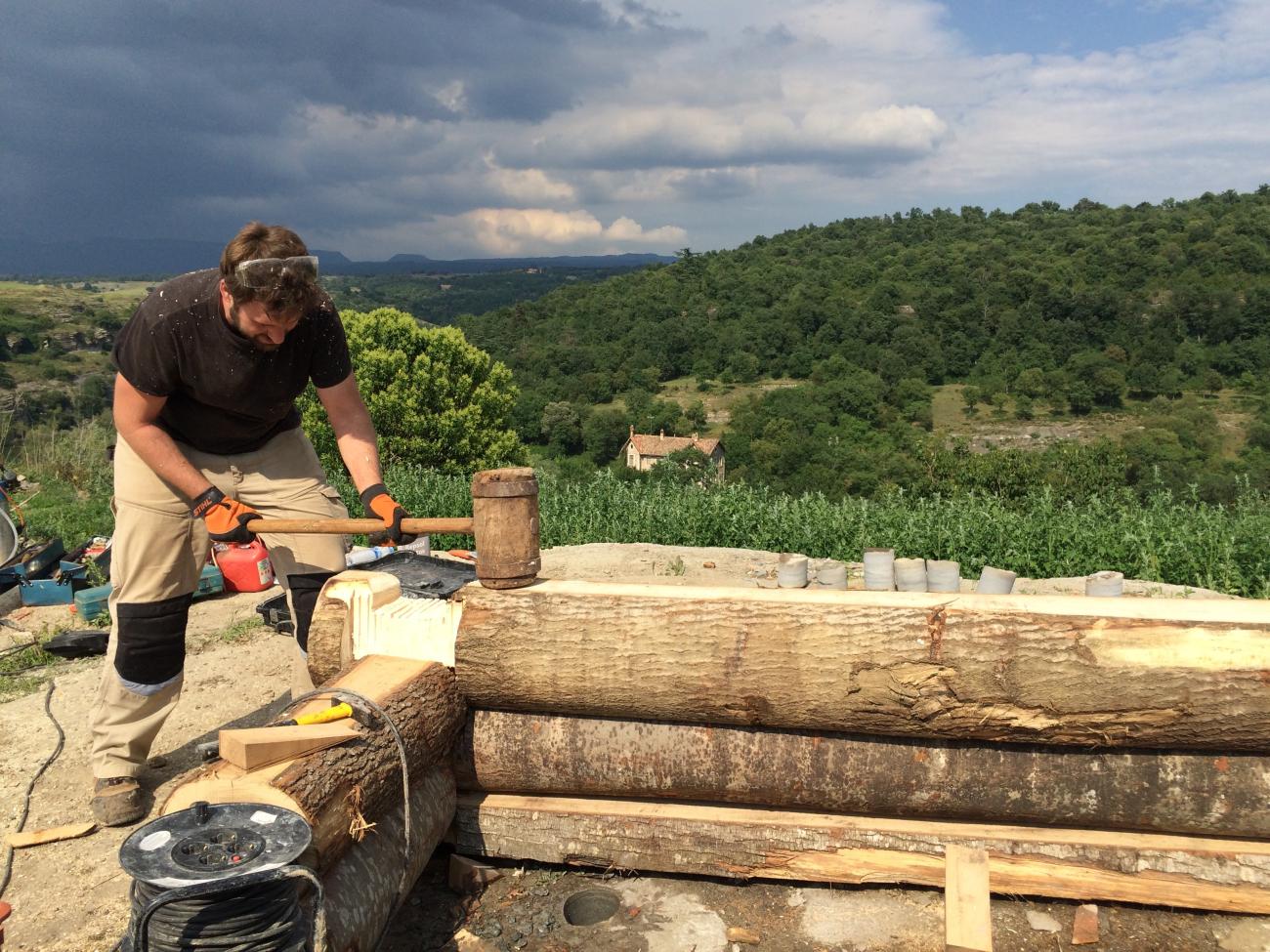 For the construction of the tower we used only the wood species identified from the archaeobotanic analysis of l’Esquerda site samples of carbonized seeds and woods from excavation. These species were: Maple (Acer campestre), Chestnut tree (Castania sativa), Cherry tree (Prunus avium), Beech (Fagus sylvatica), Ash (Fraxinus excelsior), Oak (Quercus sp.), Poplar (Populus tremula), Alder tree (Alnus glutionsa) and Black poplar (Populous nigra). The trees used in the experimental tower construction had been cut from an ecological forest by a specialised company who then delivered the wood. We used fresh wood, like Carolingian army probably did when they arrive in a place and must construct watchtowers very quickly. The trunks were all cut at the same lenght, 9 Carolingian feet, easier to carry away and to build.