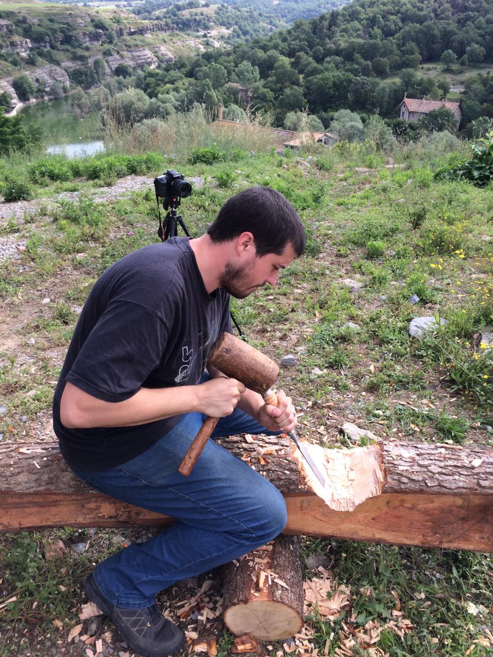 To ensure a level base and therefore a straight upright tower, we placed the wood with the widest diameter on the deepest side, measuring and adjusting the inclination with a waterlevel. The architectural plans of construction were followed, cutting the wood with axes to fit one with the other without the use of nails. Once the base was level, we carvered the postholes in the rock using hammer, slope and wedges. These postholes do not support the whole structure, but rather the posts placed into them to prevent the lateral or twist movements of the structure when the wood is drying. Following the features observed archaeologically at l’Esquerda, two different postholes types were made: 10 of 8 cm diameter X 15 cm depth with a working time of 1 hour and eight holes of 16 cm diameter X 20 cm depth with a working time of 2 hours minimum. In total, it took 26-30 hours to drill the holes in the rock.