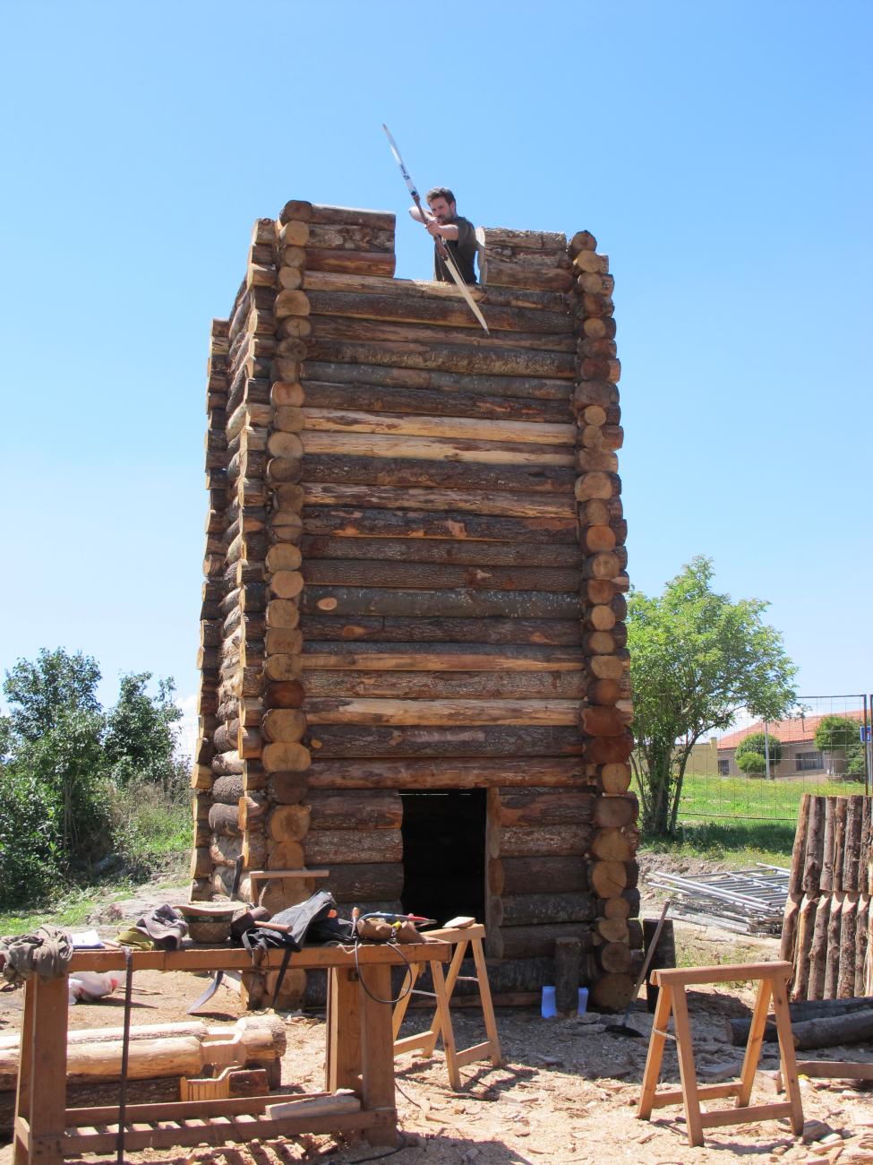 As we raised to the desired height (two floors 7,5 m) we proceeded to cut the crenels on the top of the tower. But how many and how wide did these have to be? We could see depicted in Saint Peter’s Roda Bible a wooden tower with crenels, but the solution came from experimentation: we took a bow and measured the space that the archer needs to work the bow. The result was a single space crenel of about 3 Carolingian feet.