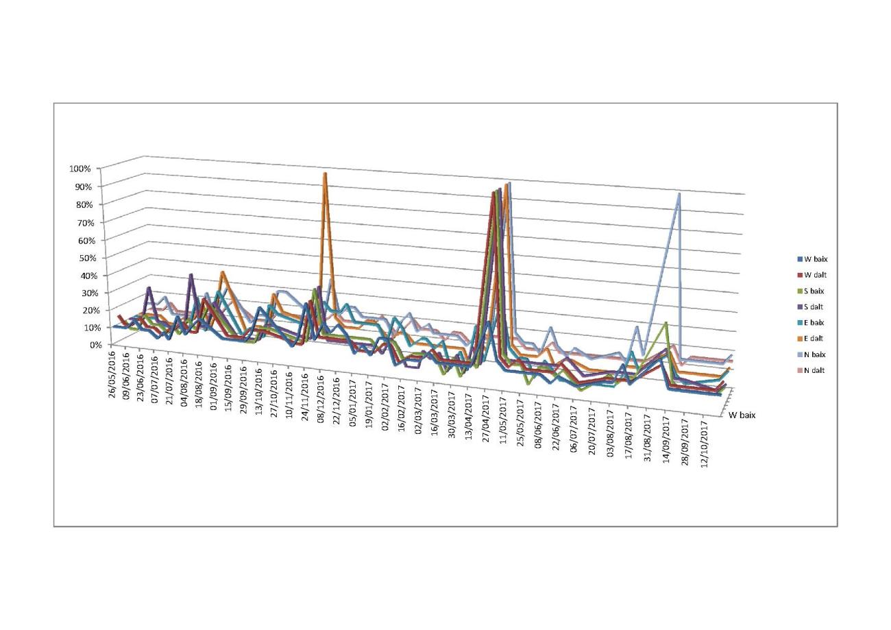 Once the experimental watchtower was constructed we began to make some controls about its stability, inclination, and effects of humidity and fungi growth in wood deterioration. These controls are made once a month. The control of humidity allow us to know the effects of sun, rain and snow along the year. The graphic shows the results from June 2016 until October 2017. Two picks can be clearly seen on it, one in December 2016, with the maximum of humidity corresponding to some snow and rain acumulated in early winter, and the other one in April 2017 due to the spring rain. The snow affected especially the high north face of the tower (N dalt), while the spring rain affected the tower’s whole faces (N-S-E-W) from high to down (dalt-baix).