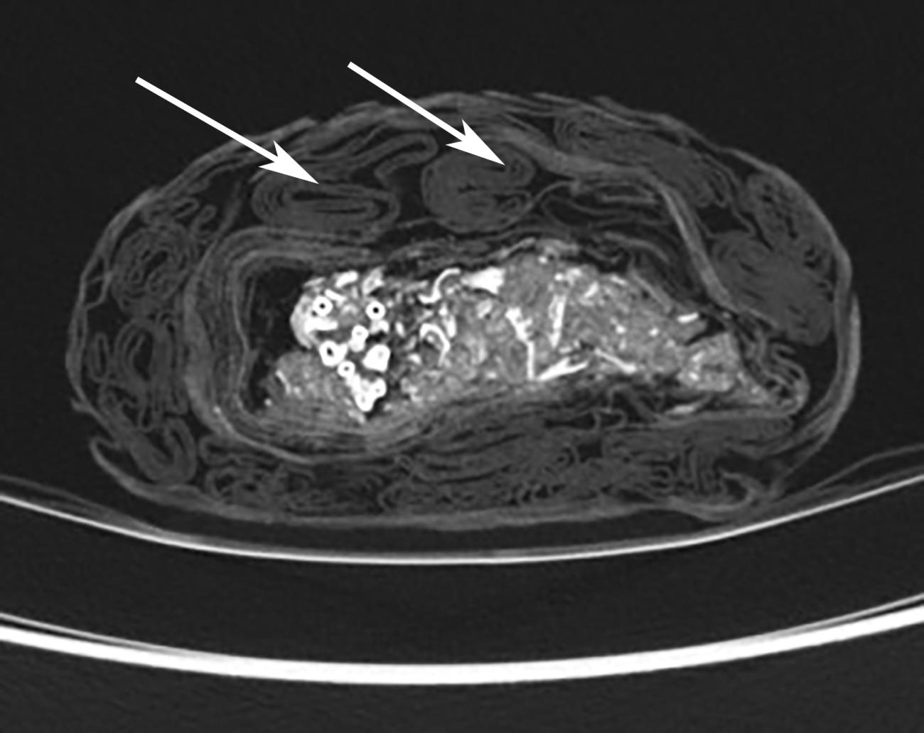 Wherever possible, radiographic imaging (digital X-ray and CT scanning) is used to visualise the contents of wrapped mummies. A major advantage of CT is the ability to manipulate scan data using post-processing techniques to identify bundle construction techniques and the underlying composition of stylistic features (McKnight, 2014). Evidence suggests that ancient mummies were produced using a ‘conveyor belt’ production system, allowing maximum throughput as multiple craftspeople took on defined roles (McKnight, 2014, p.247). This is evidenced radiographically by the multiple clearly defined stages of linen wrappings applied concentrically at varying compressions around the core.