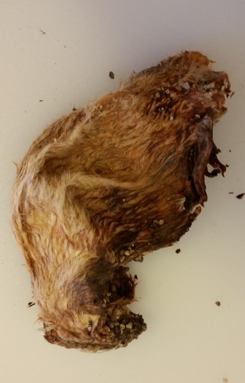 In natron, it typically takes a human body 40-70 days to reach full desiccation (Payne, 2011). Following the Egyptian mummification protocols, it took the rat carcass 23 days to fully desiccate in the natron matrix. In total, the Egyptian rat lost 141.5 grams from the mummification process. The eviscerated and desiccated organs were weighed separately from the rat-mummy and weighed 9.21 grams. The rat-mummy weighed 70.5 grams fully mummified. The rat carcass was well preserved with no loss of ears or limbs. The fur of the rat, as well as its’ facial features were extremely clear (See Figure 12).