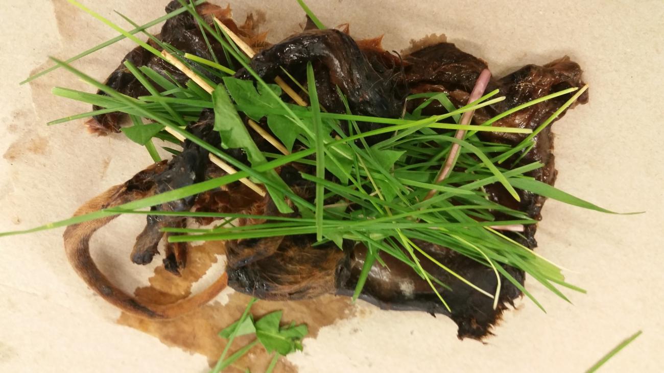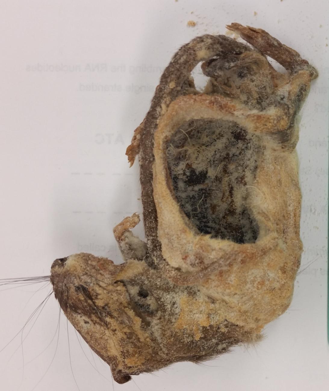 To begin the ‘Black Technique,’ the rat was washed in saltwater, eviscerated and skinned but not dismembered. The choice was made not to dry the skin or removed flesh in hot ashes or coals, as the Inca would have done because we did not believe it would impact the overall desiccation process significantly. Drying of the skin and flesh in coals could easily be done in future applications of the protocols developed from this project. The rat carcass was washed in Chicha corn beer which was homemade for this project. Inca skin would have been set aside and stuffed with vegetable matter and animal hair. The rat carcass was stuffed with vegetable matter, specifically grass (See Figure 9). As the skeletons of the Incan deceased were often reinforced with sticks, this was attempted with the rat carcass by reinforcing its body with toothpicks. The Inca often made mummy bundles in which the deceased would be placed in a fetal position and wrapped into bundles using textiles. The rat in this study was not wrapped in textiles, but it was placed in the fetal position. The rat mummy bundle was bound together with twine (See Figure 10). Clay masks and wigs were sometimes placed on the body by the Inca (Rosso, 2014). In future uses of these protocols it would be easy to coat the outer surfaces of the specimen’s face with white ash paste or clay to model the ritual of the clay mask.