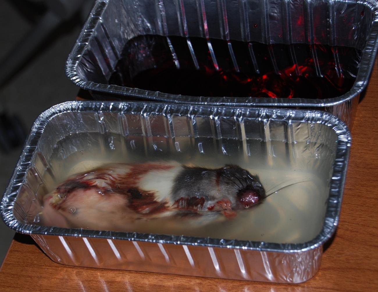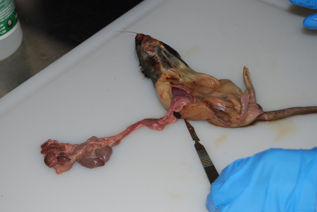 Egyptian mummification, an artificial preservation technique discovered through hieroglyphics, was a sacred process in Egyptian culture. The details of sacred practices such as mummification processes were not recorded by the scribes (Gashe, 2010). To mummify the rat, it was first washed in saltwater and wine (See Figure 4). The wine must have at least 14 percent ethyl alcohol, the ethyl amount equivalent to Egyptian palm wine. Palm wine was traditionally used by Egyptians to help limit bacterial activity in and on the deceased’s body. Using a scalpel an incision was cut in the right side of the rat’s abdomen (See Figure 5). Egyptian mummies were fully eviscerated through an incision in the abdominal cavity. This includes removal of the brain. An attempt was made to remove the brain from the rat carcass but due to the small size of its nasal cavity, removal of the brain was unsuccessful (Lace, 2012). In the 12th Dynasty (1991-1782 BC) Egyptians began leaving the heart inside the thoracic cavity due to their belief that the essence of the person lived within the organ (Abdel-Maksoud and El-Amin, 2011; Payne, 2011). Internal organs were washed with saltwater and wine (See Figure 6).