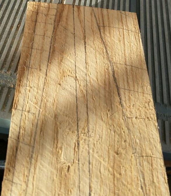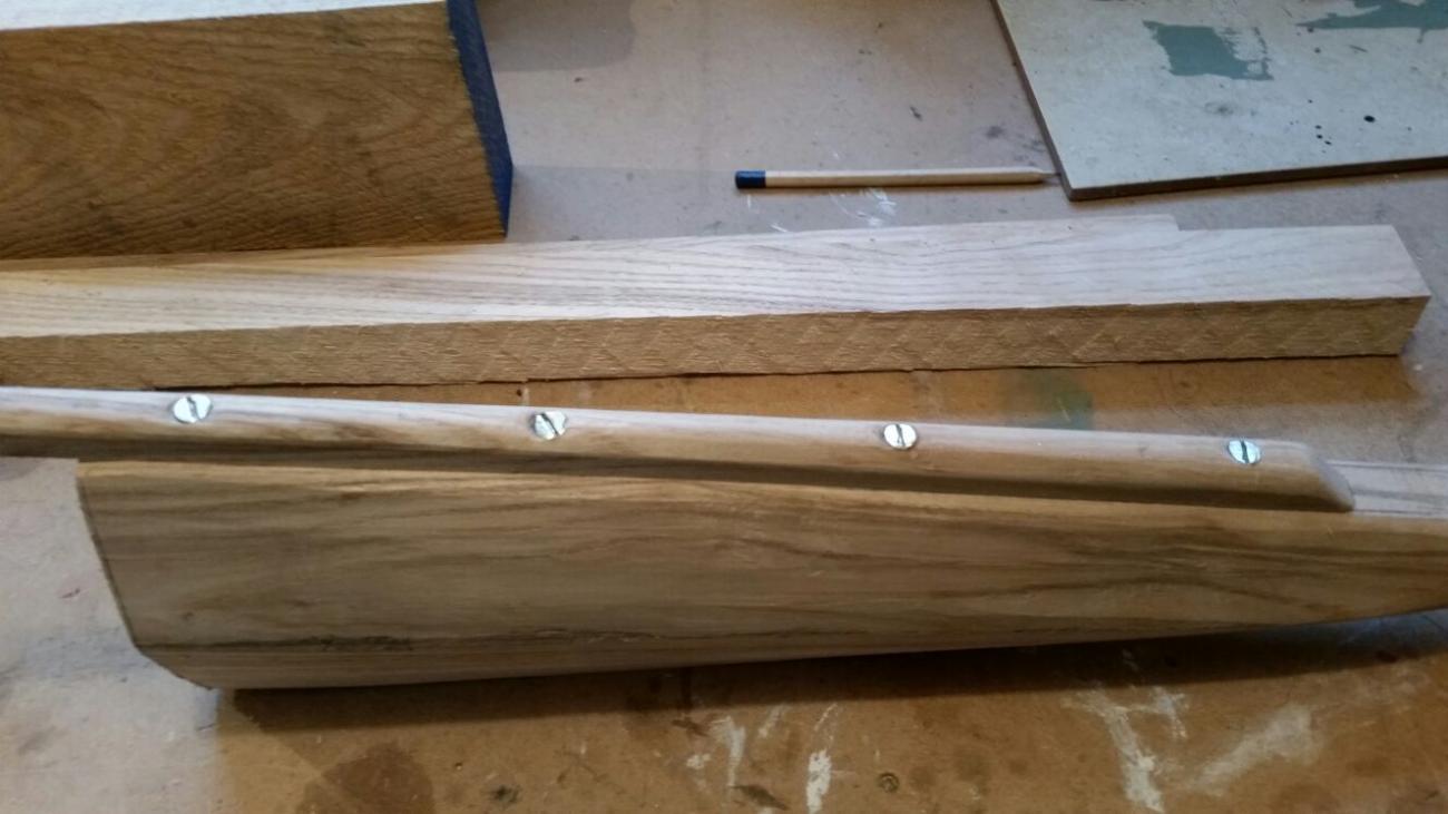 The wood was sourced partially prepared from a local boat yard as seen in Figure 1. The main structure of the ‘box’ peg leg comprises three individual wooden components (See Figure 2), these are the lateral stabiliser, a base to hold the stump and the peg. Based on Lazenby’s (Lazenby and Pfeiffer, 1993, p.22) description of the proportions of each three sections, the wood was measured and divided into three parts. A ruler and pencil were used to mark out the areas, which would be cut to size, with the offcuts highlighted by the hashed pencil marks (See Figures 3 and 4). Initial observations of these measurements indicate a large amount of waste. The stump is 45.2cm tall 15cm wide at the bottom, its thickness is also 5cm. The stabiliser is 87cm tall and 2cm wide by 2cm thickness. Finally, the stump support block is 2cm tall, 15cm by 8cm wide. In total this makes 0.003978m3 which means the off cuts and potential waste is approximately 0.003147m3, almost half the original amount of wood sourced. As few records explain production processes of a peg leg, especially ones which suggest a use for the off cuts of wood, it may be practical to propose this wood was used for other purposes, perhaps in the prosthesis manufacturers other businesses as cobblers, clockmakers or carpenters. Alternatively, the offcuts could have been used in ways described below.