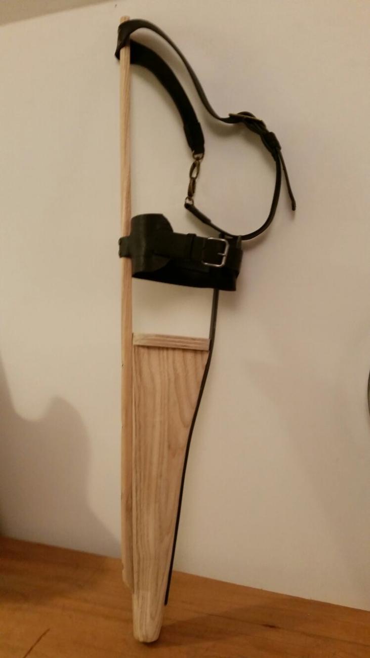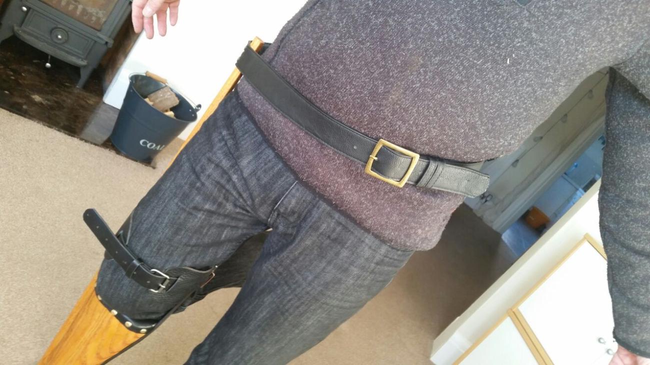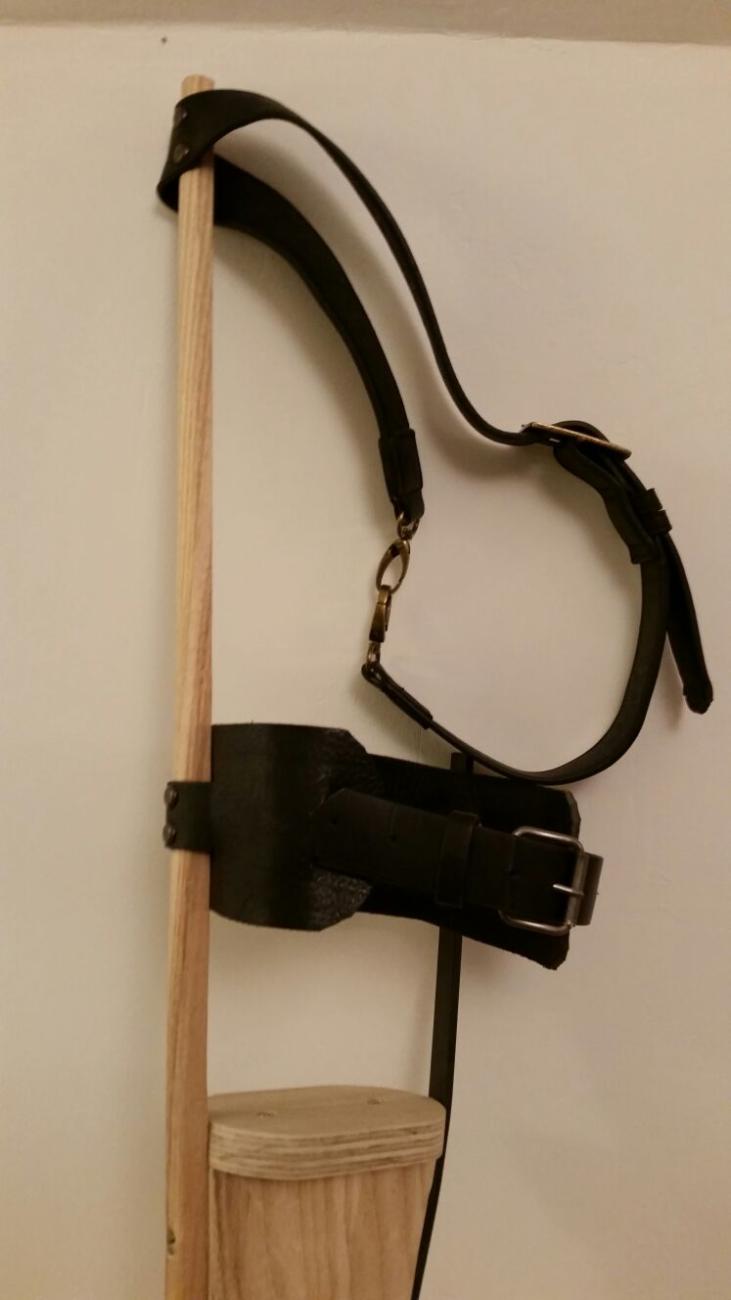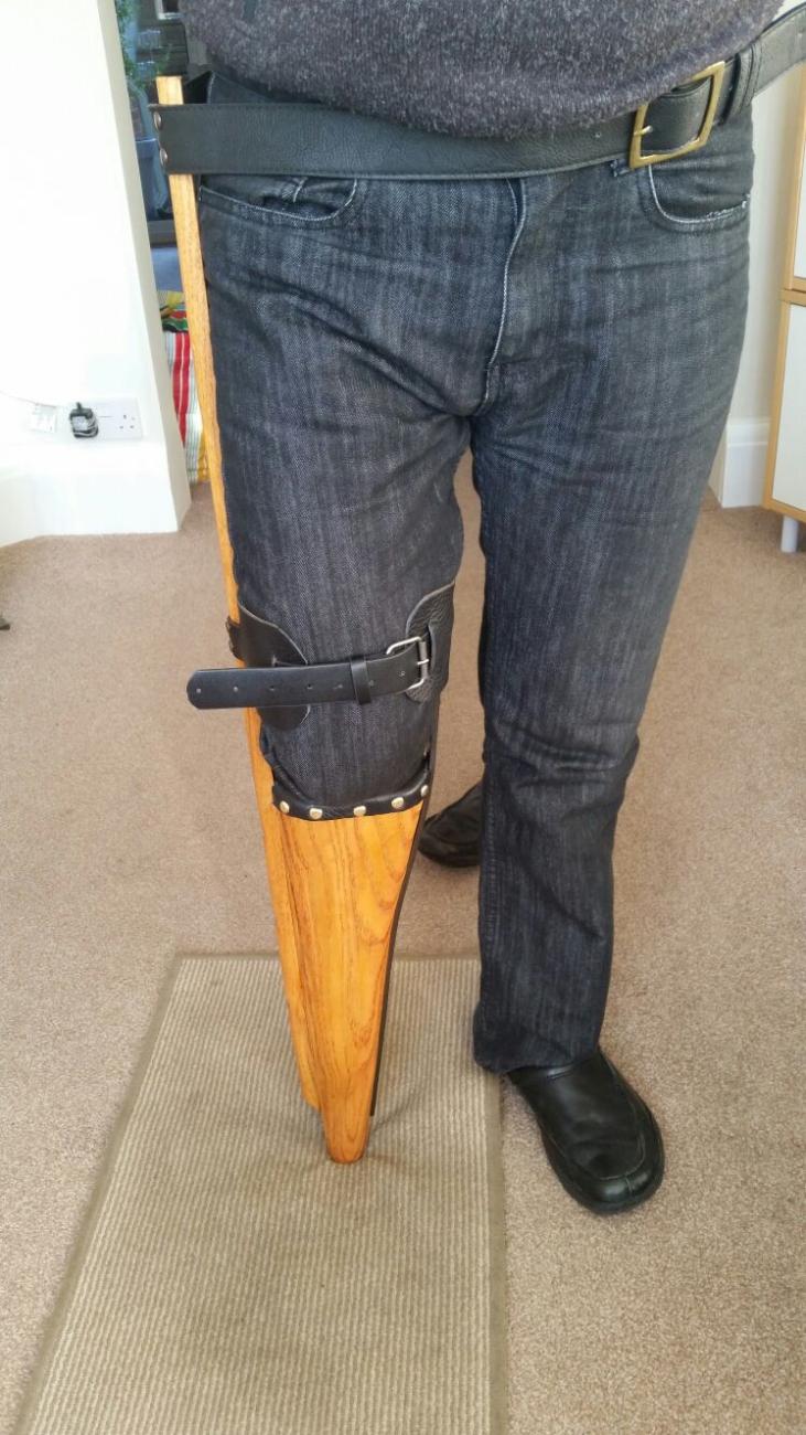 The next phase involved attaching the leather waist support to the lateral stabiliser, again that was secured in position using two copper-alloy tacks (See Figure 14). The last leather that needed to be attached was the leather covering the stump support, this involved cutting to size the circular piece of leather required and then stretching over the wooden support block. It was secured in place using some hide glue and ten copper-alloy tacks, then the excess leather was trimmed away. The completed the leg was then polished and varnished to bring out the woods natural grain, making it more aesthetically pleasing. Figure 15 shows the completed leg, Figure 16 shows how the limb looks whilst being worn. Figures 17 and 18 shows how the straps fit the torso and upper thigh.