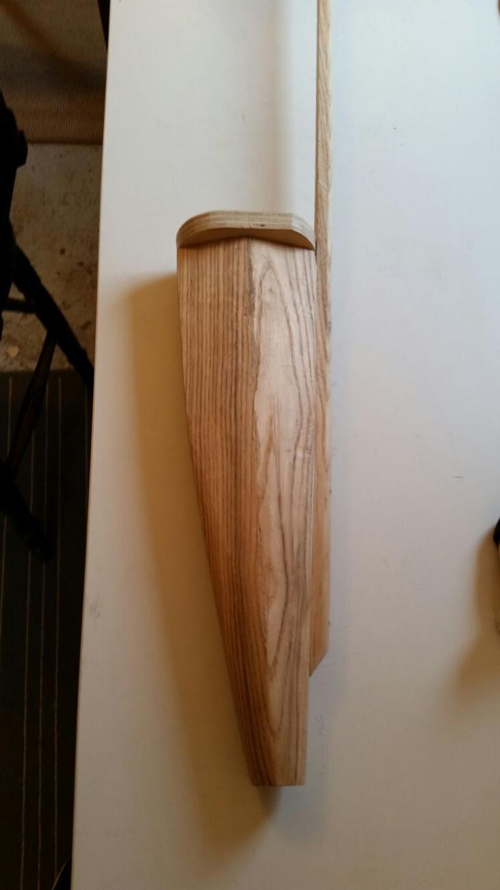 The next section of wood that was measured and marked out for cutting was the lateral stabiliser. This is attached to the outside of the thigh stump to provide support. It is a thin piece of wood, which can move and bend slightly with the wearers movements. The final wooden element to be produced was the stump support (See Figure 8). This is a solid block, which was used by the amputee to place their leg for stability. It is the point of contact between the prosthetic and stump and therefore requires the most attention to ensure pressure and forces on the stump are minimised to reduce pain. The support was chiselled and carved to the template drawn onto the block originally, the edges were then smoothed to remove any splinters or sharp edges which may eventually cause discomfort to the wearer or damage to the leather which will be attached. Open socket peg legs had cloth rags to provide cushioning for the distal end of the stump, allowing a free range of motion, however, these were not added by the manufacturer, they required extra materials and therefore expenditure so the amputees were told to “rest the knee on a very full pad, otherwise it will soon become tender and incapable of transmitting the weight of the body to the artificial appliance.” (Bigg, 1885, p.67). Gray (1855, p.78) claims that the endeavour of artificial limb makers was ‘to make the stump fit the socket, not the socket fit the stump’. As the padding was not originally supplied by the manufacturer, it has not been included in this production. However, for the wearer’s comfort during gait analysis it will be supplied.
