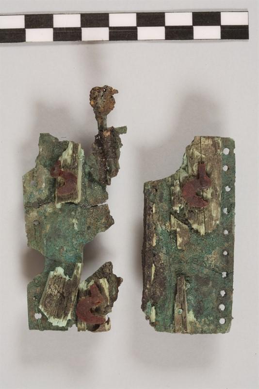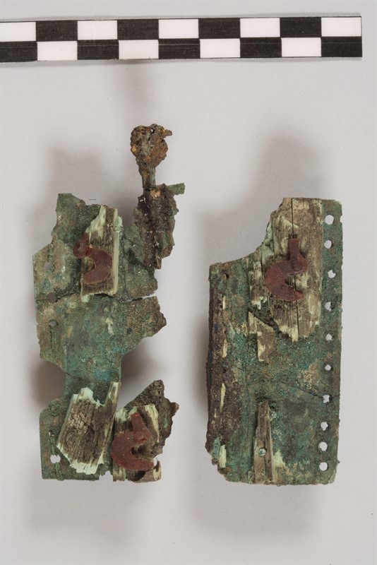 Those tiny nails have then the double function of both holding the ducks in position on the ivory plates and reproducing the animal’s eyes. Once all of those pieces were firmly secured in position by their nails (and possibly glue), the whole hinge was sewn on a textile or leather support, most probably a cloak or a belt of which it constituted the clasp. Sewing of the hinge on its support was made possible by the presence of two lines of holes drilled through the external long sides of the bronze plates.