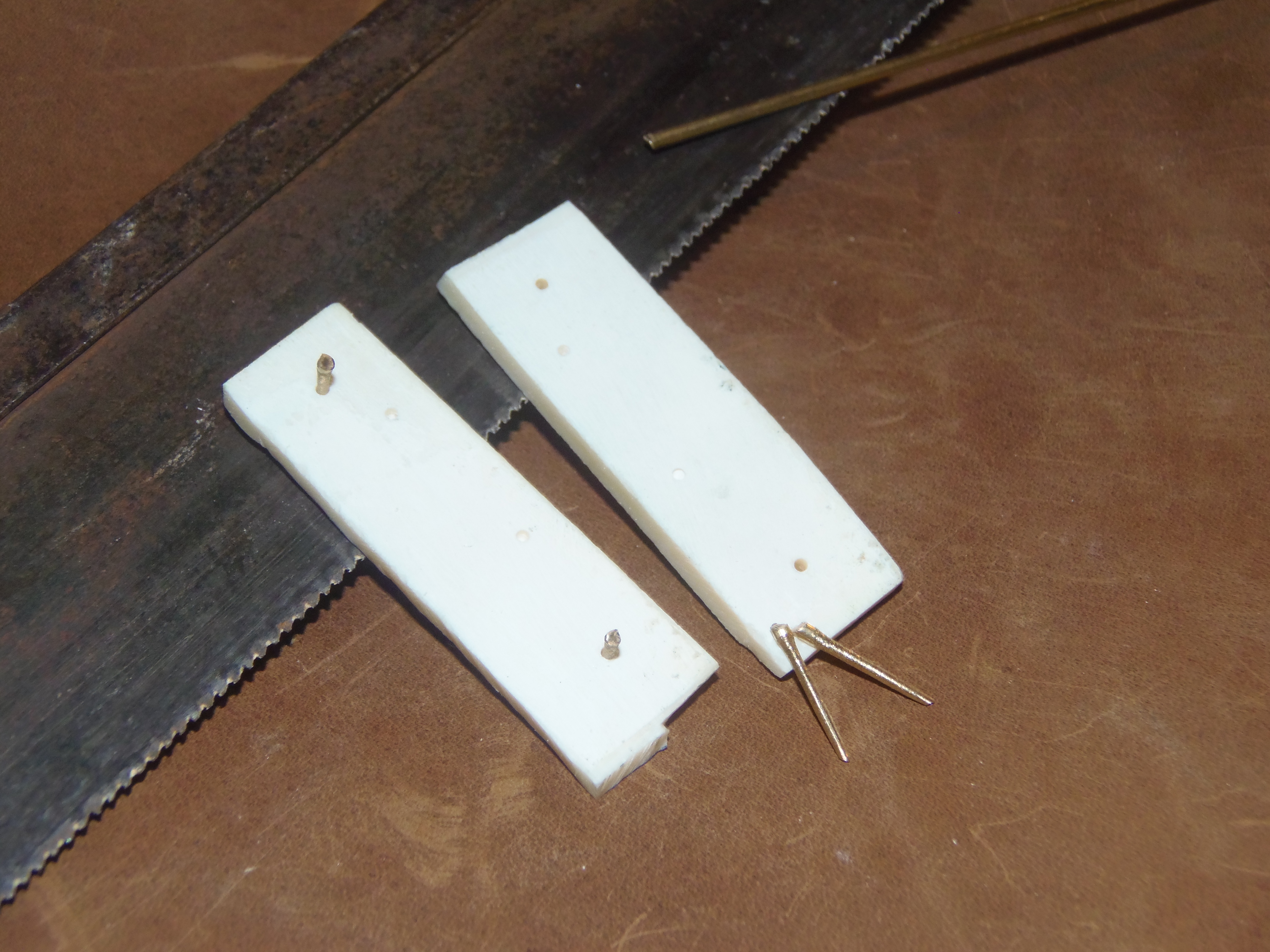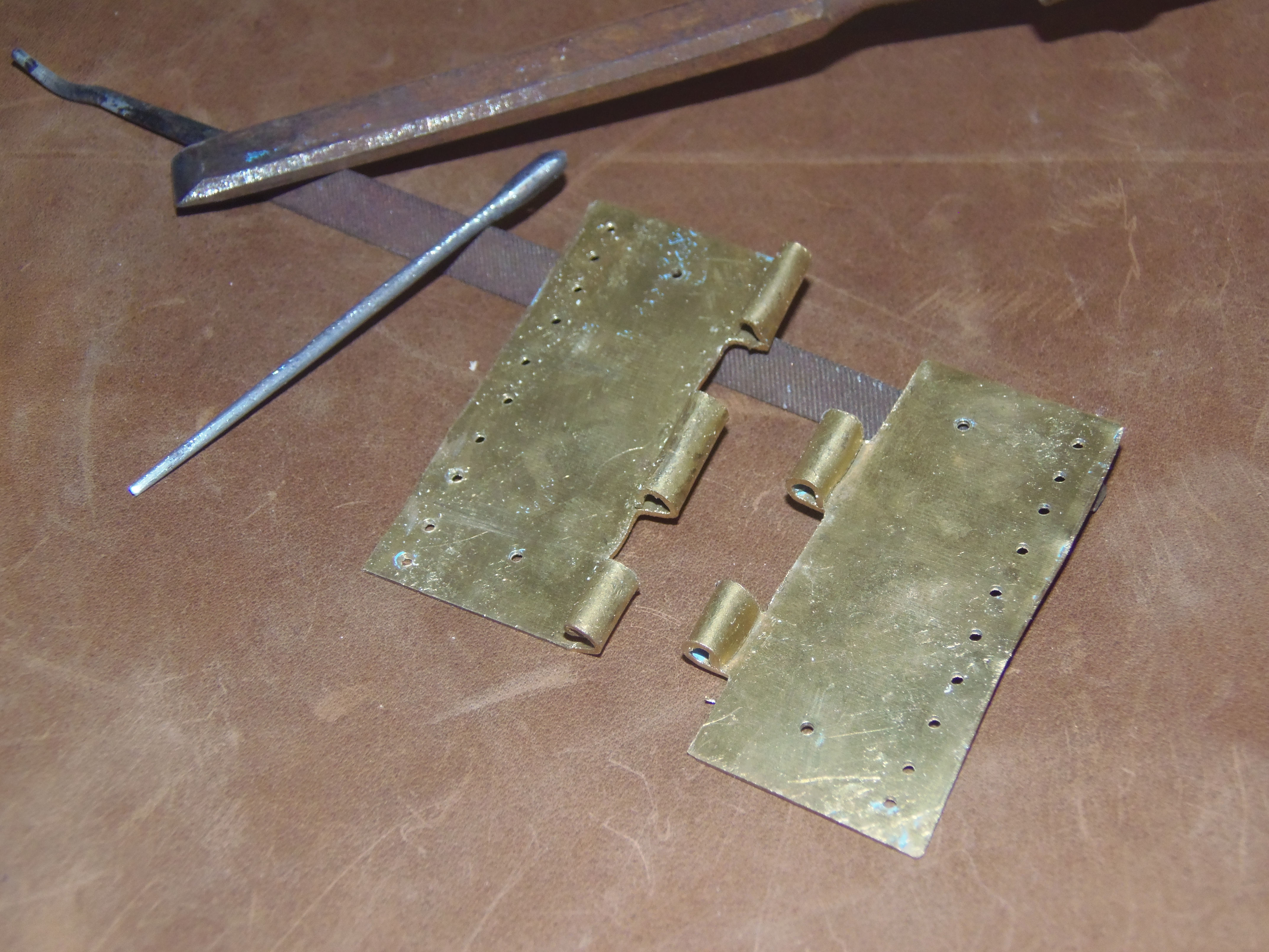 My reconstruction began by taking all of the appropriate measurements and then cutting a plate of bronze in two halves. The next step was to drill two vertical lines of ten holes on one of the longer sides of both halves, and then shaping and bending the opposite ones in order to obtain a total of five small cylinders, three on a plate and two on the other, that were to host the iron pin. Next, I drilled two holes in the center of each bronze plate, holes that were going to receive the bronze nails fixing the upper bone plates.