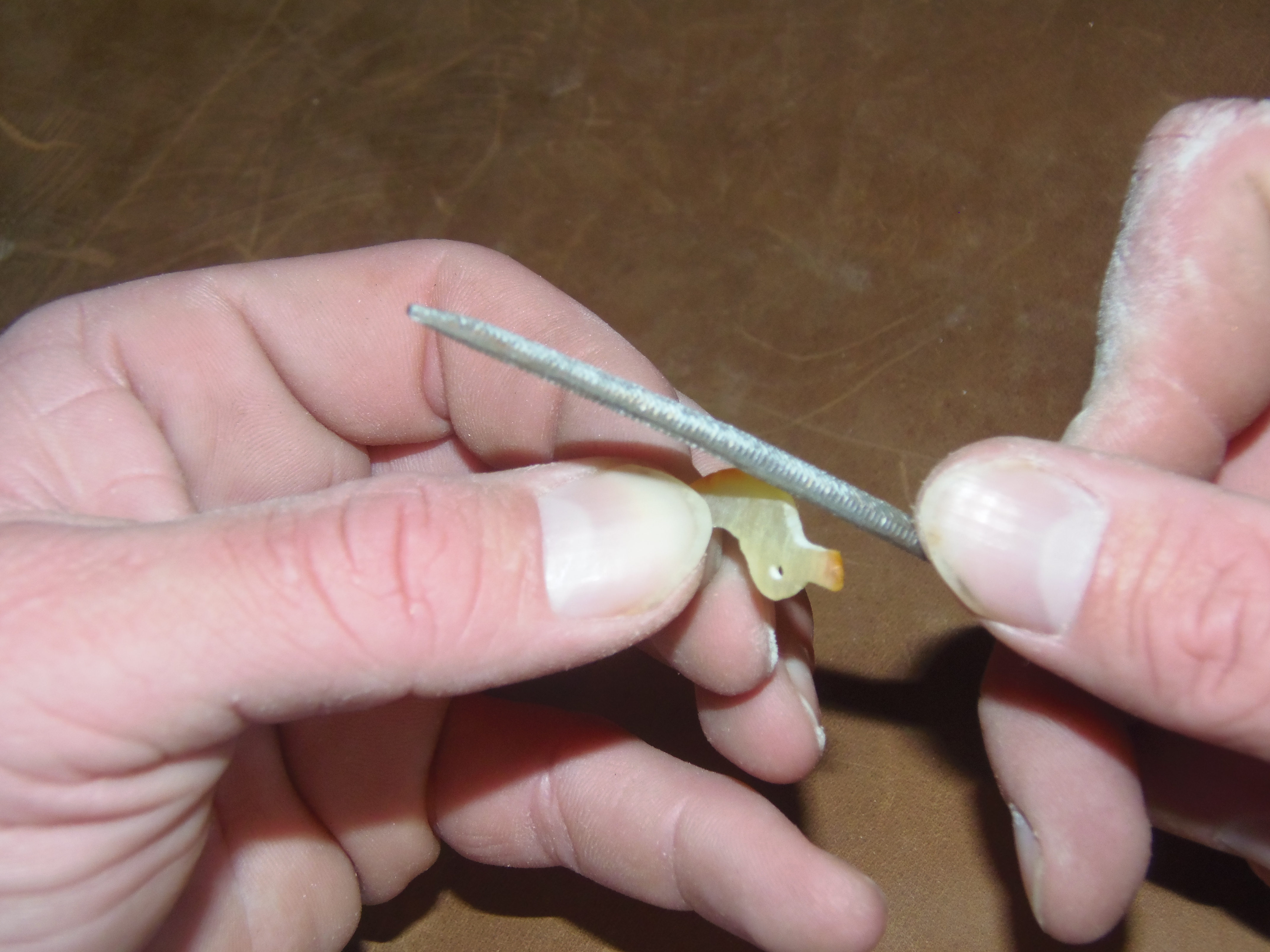 A whole different situation was making the amber nails: the picture will show better than any word their dimensions, which are really microscopic. Each nail is shorter than five millimeters and bearing a maximum circumference of a couple, at most. Compare one of them with the pencil I photographed on its side (see Figure 5) and you will understand how it was I had to waste at least eight nails before managing to successfully carve four out of another piece of superb Estonian amber.