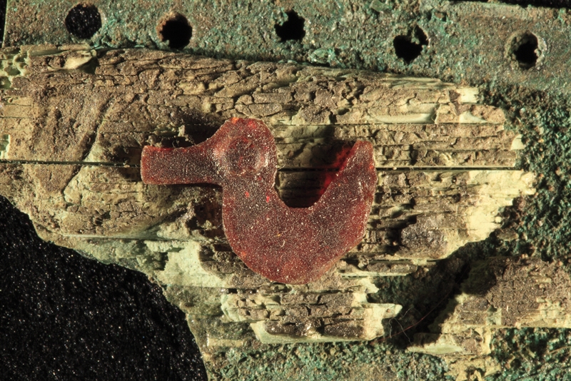 The clasp itself is basically a hinge composed of two halves rotating around a vertical iron pin. Each of the halves is composed of a bronze plate on which an ivory one is nailed. Two tiny amber figurines cut into the shape of decorative ducks are also fixed on each ivory plate. They are held in position by microscopic nails also made of amber and inserted through small holes drilled on each duck’s head.