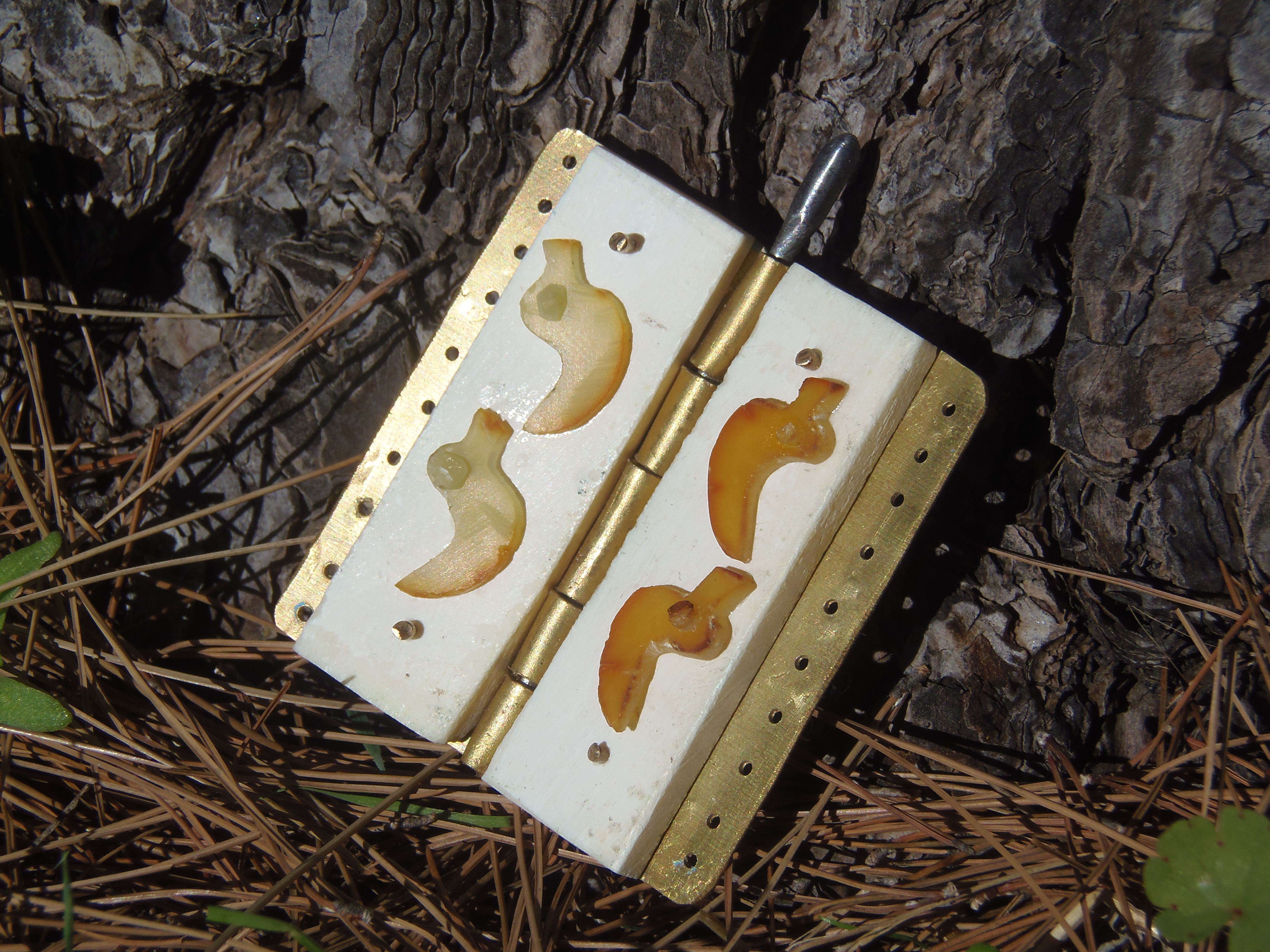Producing the ducks proved to be quite an easy task for none of them cracked during the operation, which is somehow surprising considering that none of them is thicker than one millimeter, or longer than one and a half centimeter. Even drilling the holes that were to host the nails was a success at first try. That is partially because of the extra excellent quality of the Polish amber I have used. While the specimen's amber has not yet been analyzed, the chance that Picenians imported amber from today's Poland is supported by some Authors (Von Eles, 1995; Lewanski-Kanceff, 1995; Massimi, 2012). It was also a success because I have been working very slowly, only using hand tools such as a hacksaw, a tiny drill, and files. Making these ducks took me some time but the result is worth every minute.