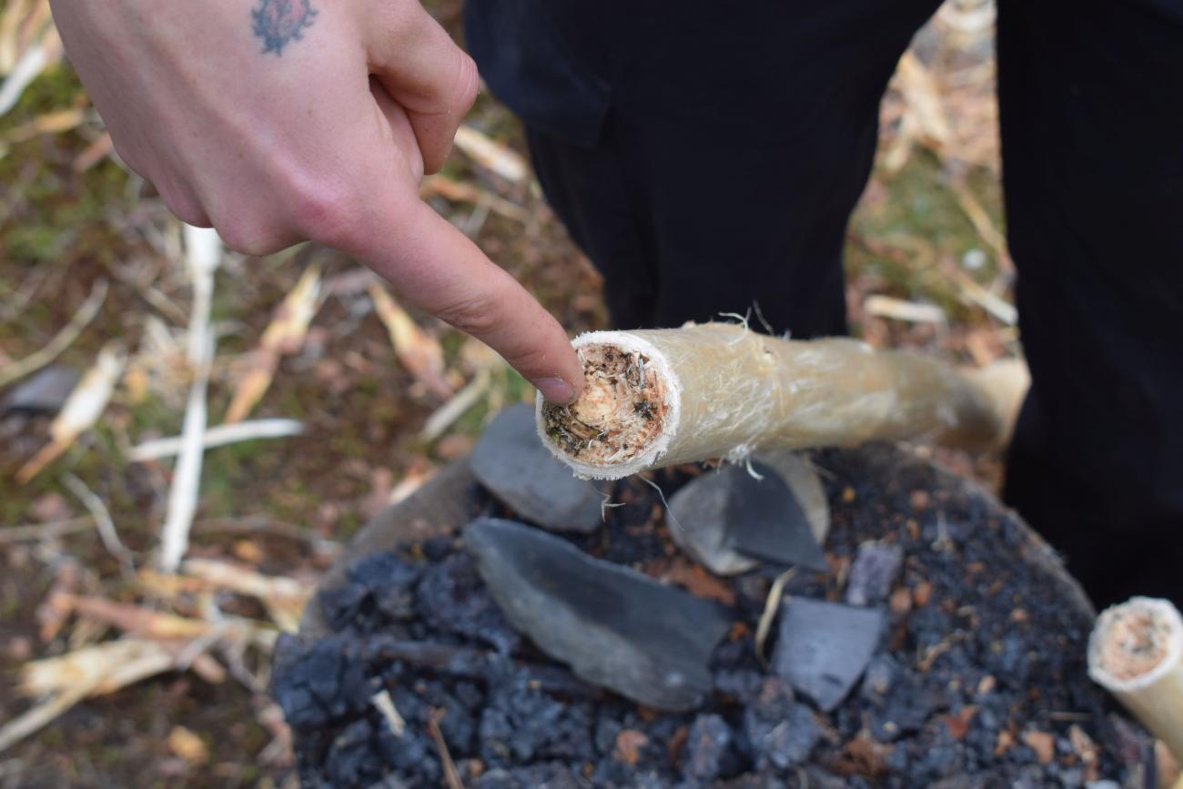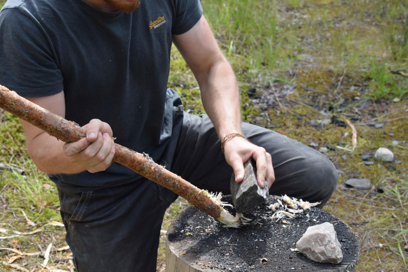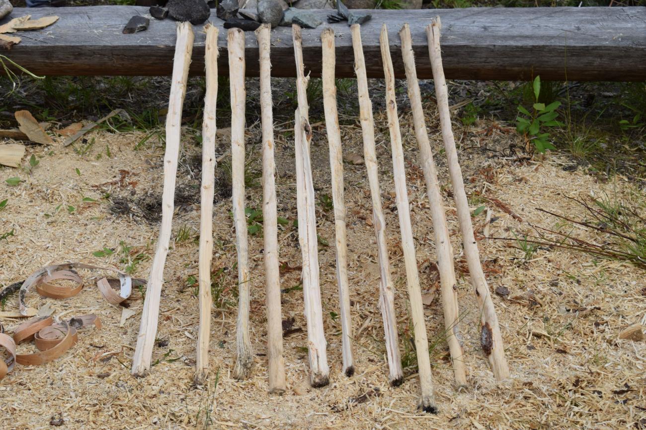 The plant materials used reflect those of the original; pine, willow, birch. Stone tools were used, however these consisted of mainly unmodified pieces of slate which were found on the ground along the shoreline. Therefore, all materials were located on site, many of them in the work area.