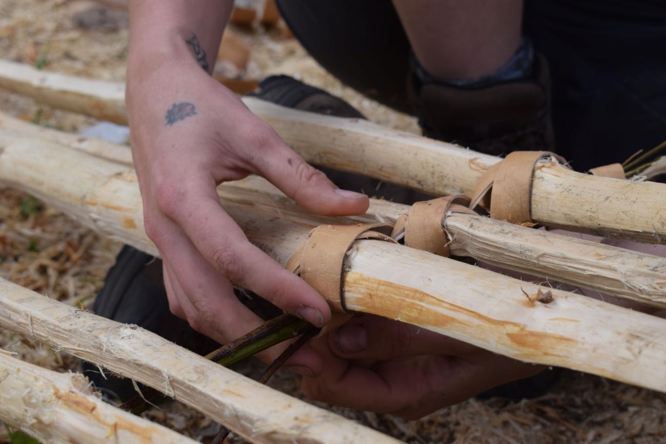 With all the materials now ready for assembly, the construction of the section was left to Evon Kirby. The laths were propped up against a log bench to facilitate easier access during the binding process (See Figure 10a). The willow rods were held against the pine laths and the birch bark lashing was bound in either an ‘X’ pattern or a simple wrap (See Figure 10b) as observed in the original. To increase the suppleness of the lashings, the birch bark was heated over a wood fire which caused the bark to curl, which allowed the bark to better retain its shape during binding.