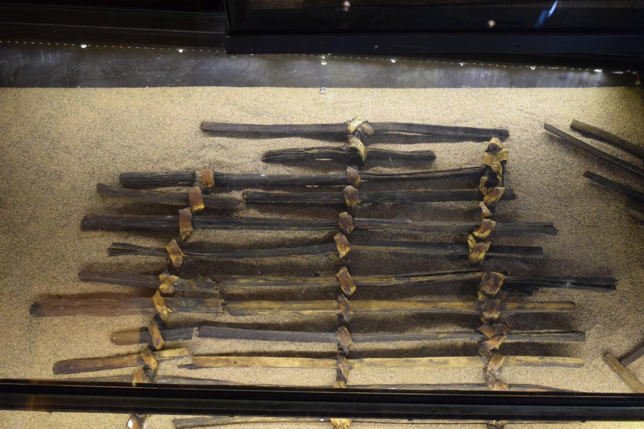 The section is constructed of split pine (Pinus sp.) for the upright laths, willow (Salix sp.) used for the cross-rods, and birch bark (Betula sp.) used for the bindings. The laths are circa 114 cm in length and 3-4 cm wide. The willow cross-rods are circa 5-10 mm diameter at their widest, while the birch bark bindings are circa 2-3 cm wide. The lath screen section on display demonstrates the creative use of materials localised to the area between 3934-2681 cal BC (See Figure 1).