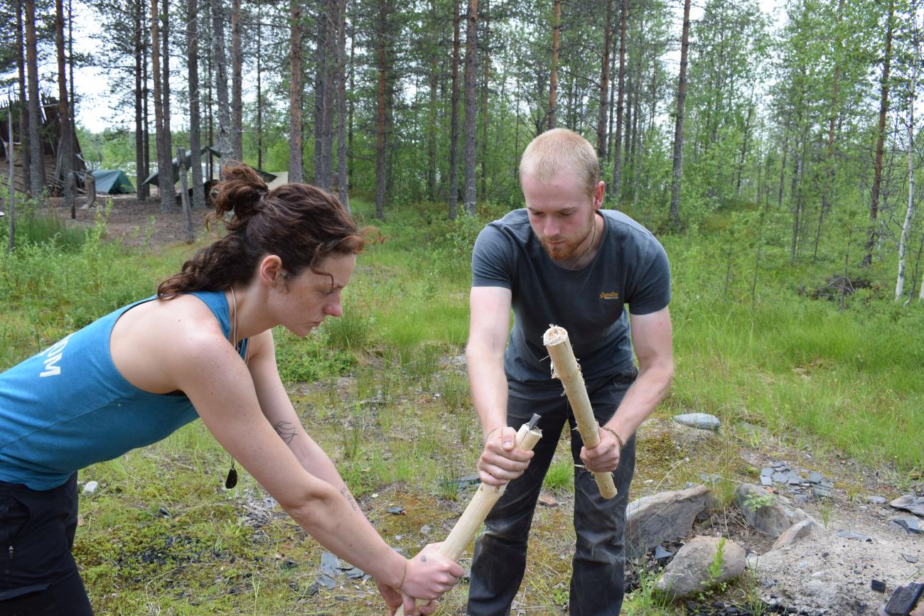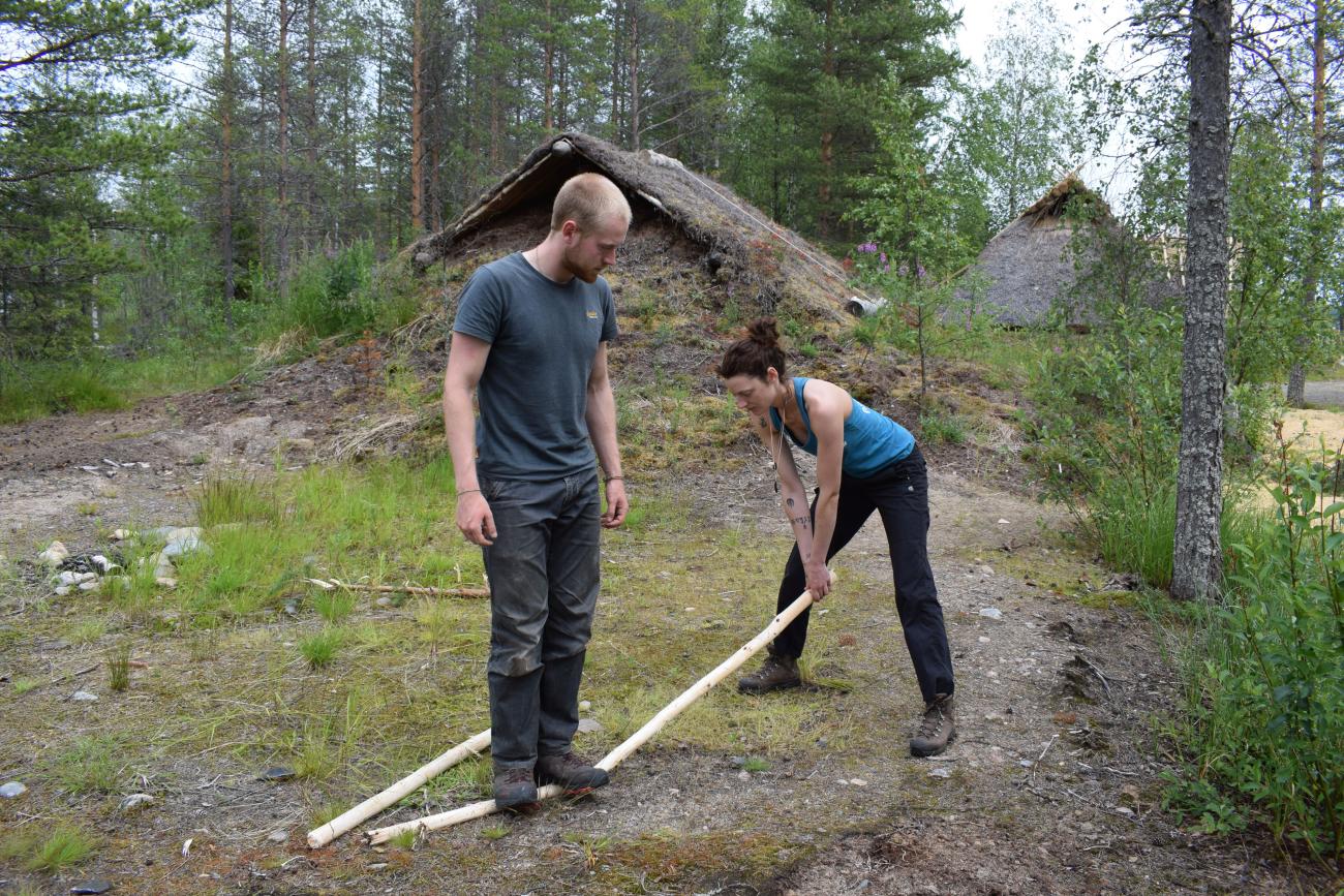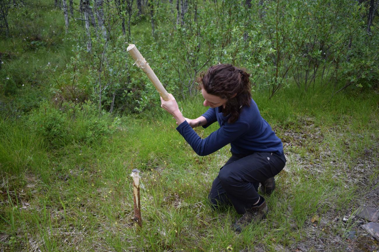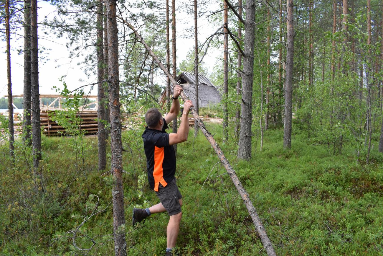 There have been several previous reconstructions of weir sections and fish traps local to Kierikki; for example, a video in the museum shows the building of a fish trap, however, metal axes are used throughout. Koivisto and Nurminen (2015) documented that in traditional fisheries which used similar lath screens, the best pine trees for the construction of the laths were found by bogs, wetlands, and coastal flats. These growing conditions produced straight, slow-growing trees with few branches. Suitable trunks were collected in winter, and taken indoors before being dried and processed (Koivisto and Nurminen. 2015). This mirrors the archaeological evidence from Purkajasuo. However, we had less time – three days in the height of summer.