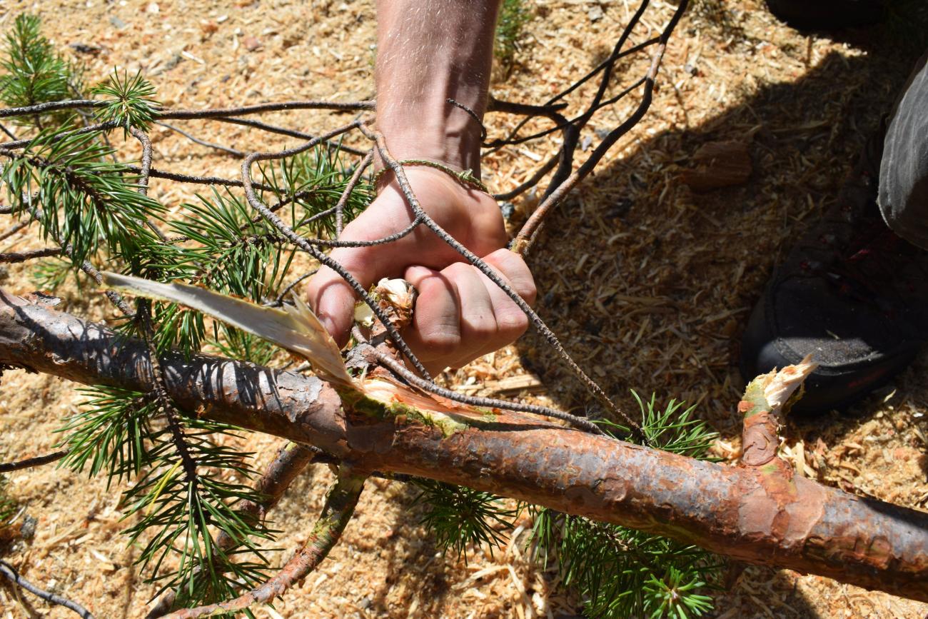 Side branches were removed by twisting and snapping by hand (See Figure 3a). The pine laths in the Purkajasuo section had no bark, therefore debarking was required. This was accomplished using an unmodified thin piece of slate that was employed in a similar manner to a skinning knife (See Figure 3b) and took 120 minutes (40 minutes per tree).