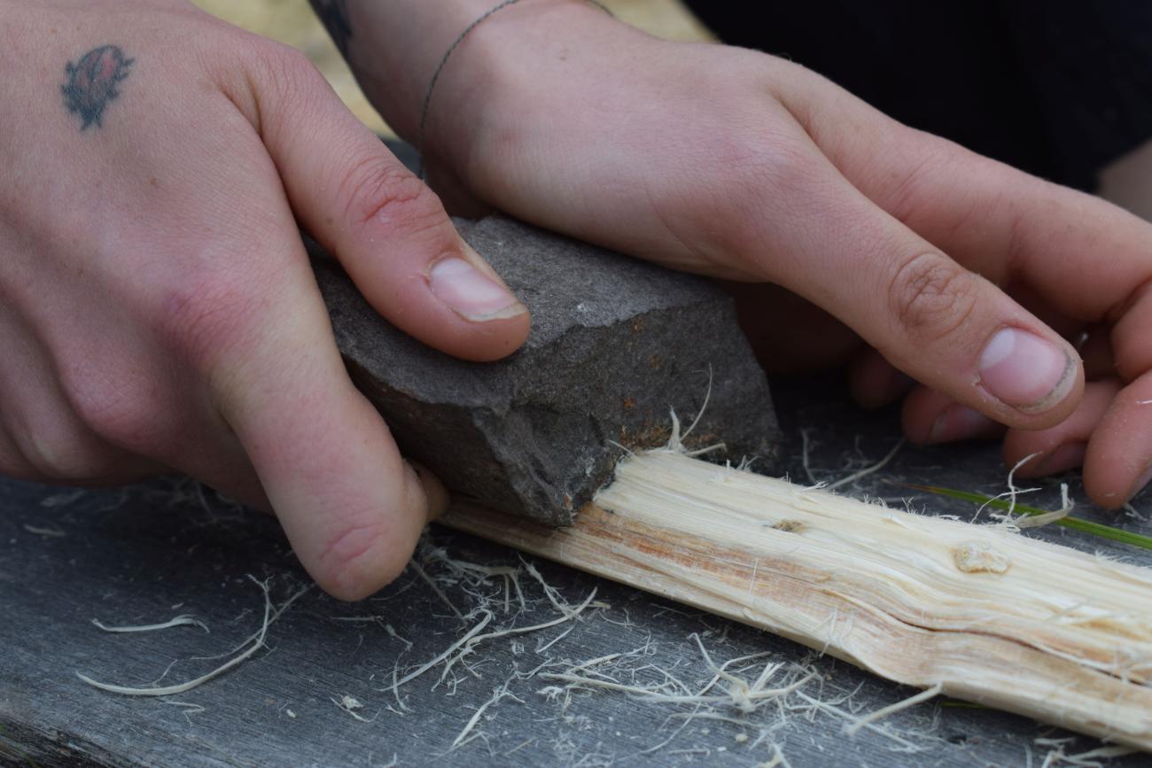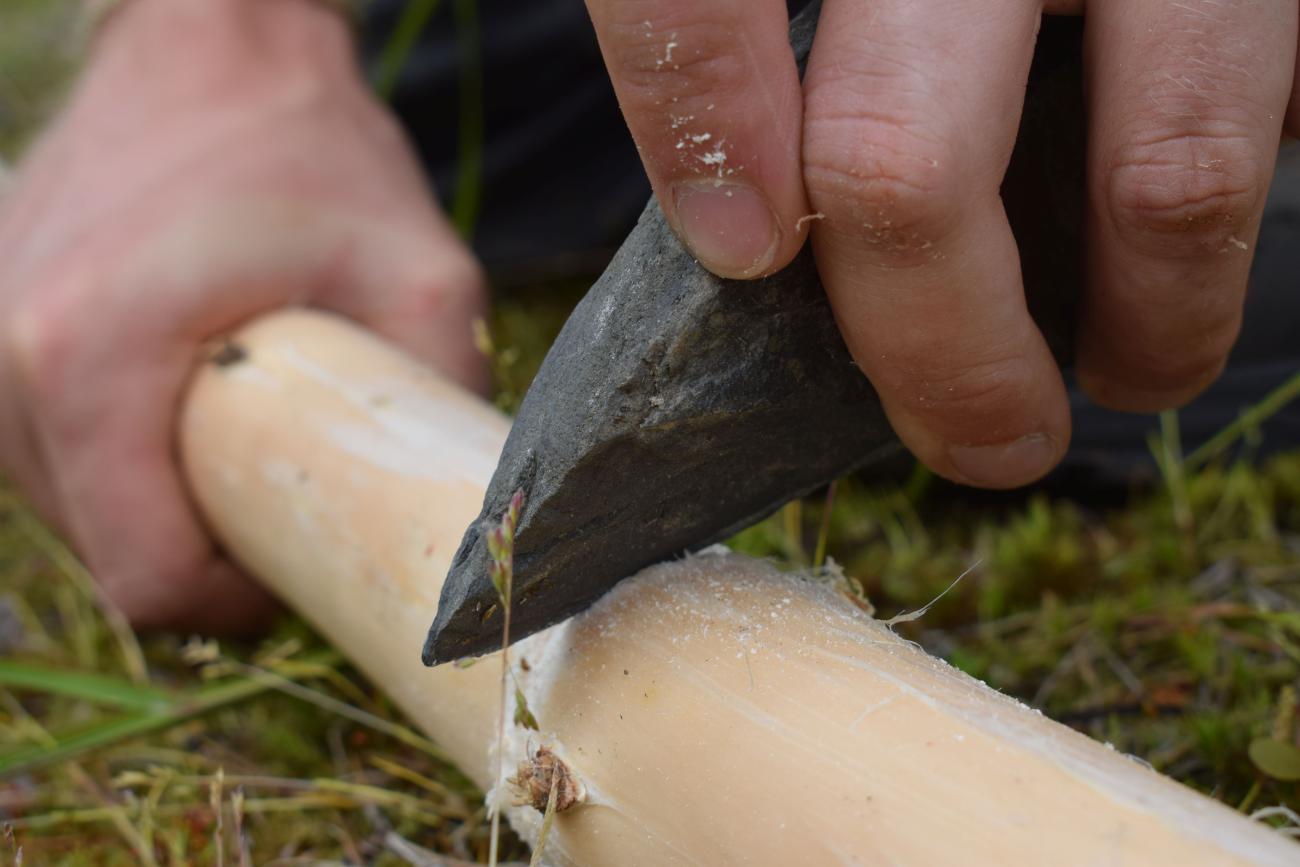 The stripped pines were cut to the desired lengths using a piece of slate, which had been modified by using another piece of slate to create a serrated edge, thus acting as a rudimentary saw. Rather than sawing through the pine from side to side, a shallow (circa 6 mm) cut was made around the circumference of the tree creating a weak point. When the cut was complete the tree was snapped at this weak point (See Figure 4), this process took 10 minutes per section. Figure 5 displays the snapped pine section, illustrating the scoring made by the modified slate tool, and the snapped fibres.