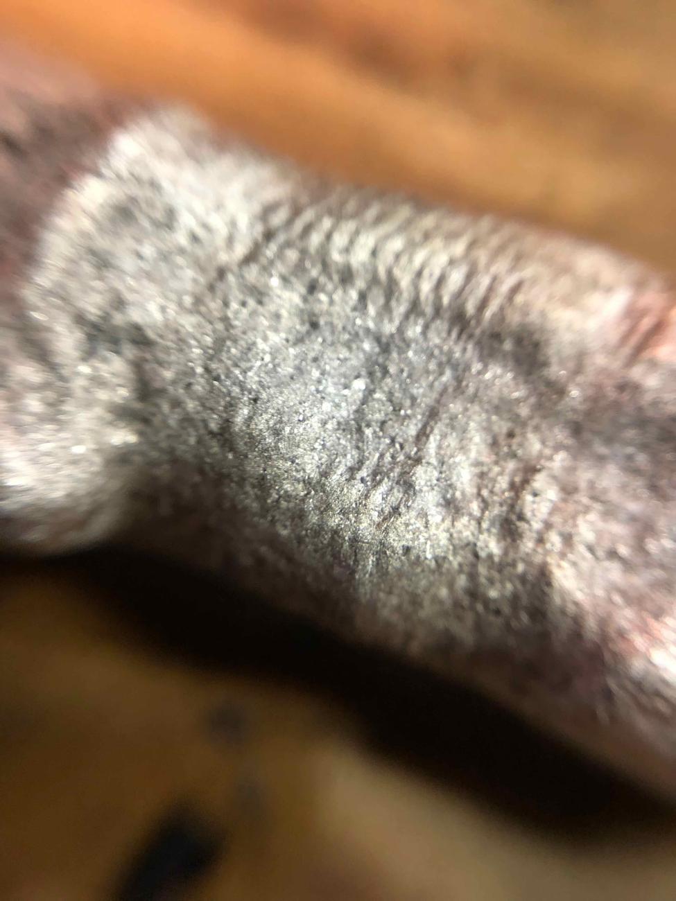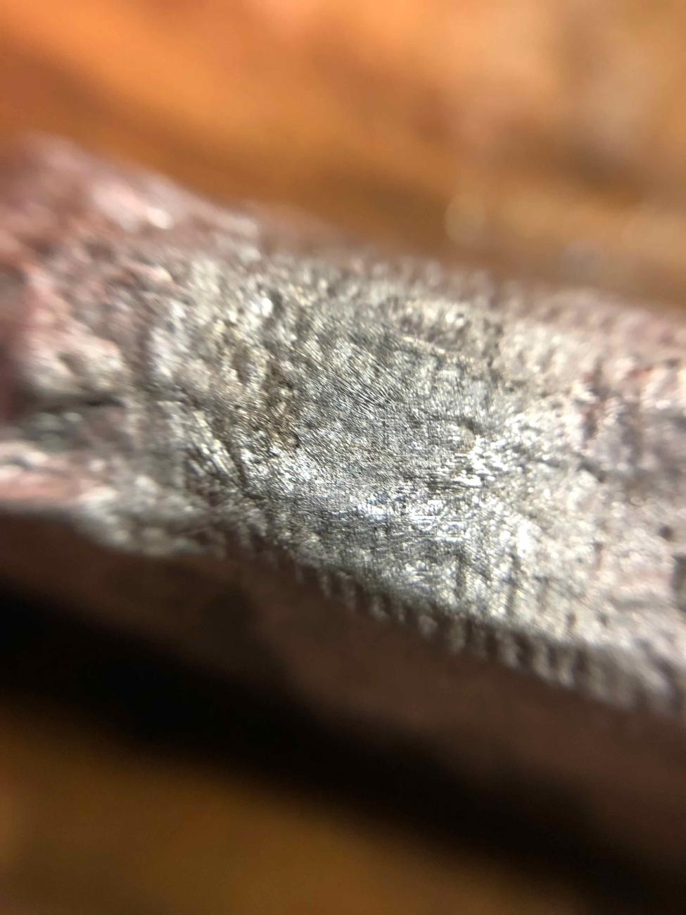 For comparison, I show the underside texture of two sterling silver ingots poured into a steel mould (See Figure 12). The ingot surface is pitted but it is otherwise smooth and not granular like the ingots poured unto the cloth and wood moulds.