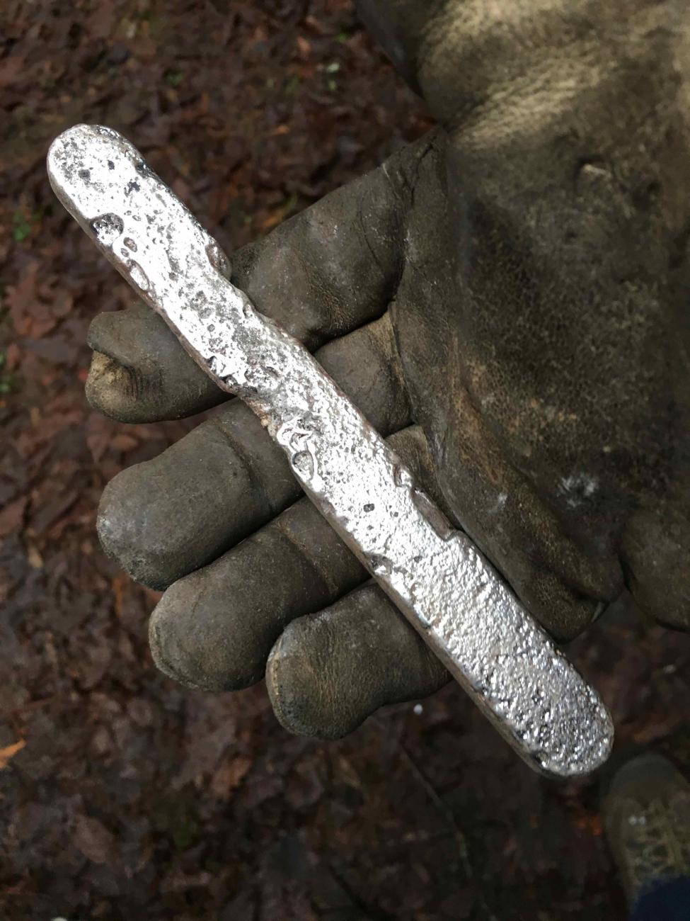 Close study of textile imprints preserved on five silver ingots from the Cuerdale, Lancashire, hoard revealed that the imprints were in the negative, meaning that the textile had been in direct contact with the metal. The presence of dendritic formations surrounding the impressions confirms that silver had been in direct contact with the fabric when it was cast ie. the molten silver was poured onto fabric placed in the mould (Graham-Campbell 2011, 82). However, earlier experimental casting of silver ingots revealed that pouring molten silver directly onto fabric caused the fabric to ignite and left no physical trace on the finished ingot (Kruse et al. 1988). I therefore approached David Meyers to see if further experimental casting could shed light on two key questions: