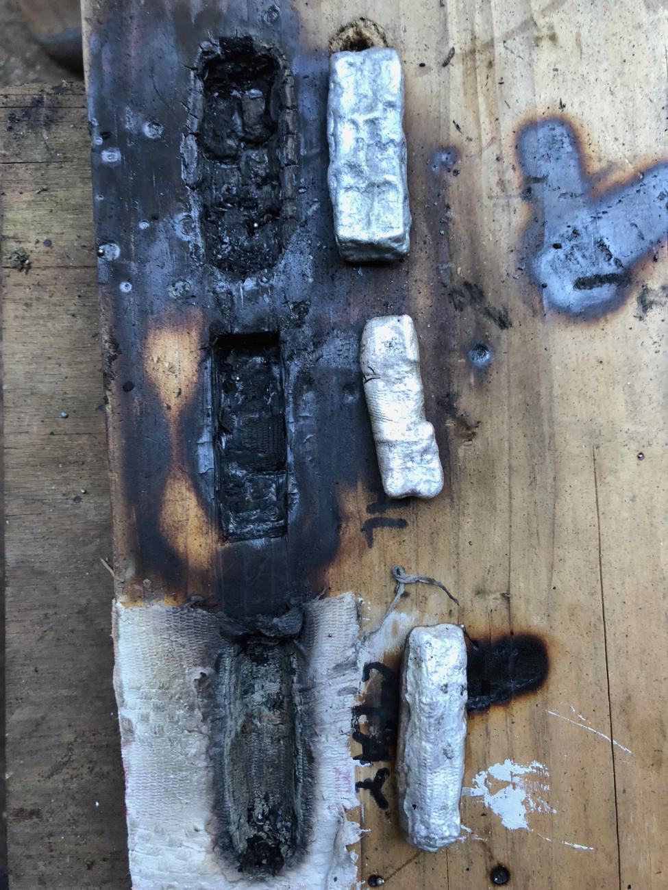 I poured molten silver into the cloth lined mould first. Just as I finished pouring the ingot it began to violently erupt and spit silver. The second ingot was poured into the mould prepared with animal fat. This was less violent than the first although it did flare up somewhat. The third mould that had clay applied to the cloth poured well (See Figure 6). Figure 7 shows the moulds and ingots after pouring.