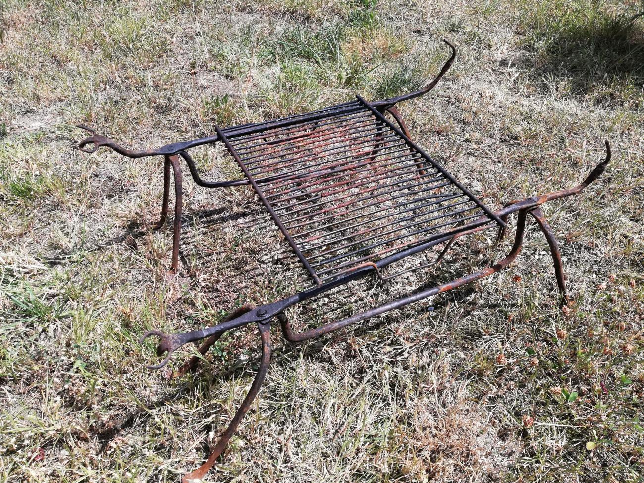 For sausage cooking, the members of the team decided to use iron firedogs (Feuerböcke), a type of cooking equipment well known in the LaTène world (Uenze, 1991, pp.173-175). These had widespread use, from the Etruscans to the Celts, Romans and then to the Illyrians (Drost, 1954, p.123). During the late La Tène period, the iron firedogs spread to the populations of the Carpathian Basin and north of the Alps (Jacobi, 1974, pp.110-111, fig. 27). From Pre-Roman Dacia, only two iron firedogs are known, found at Ocnița (ancient Buridava). They support a grate consisting of seven rods and were made from a massive bar having a stylized head of a bullock at one end (Berciu, 1981, p.45, fig. 33-34, 9). They could hold either a clay pot for cooking, meat or sausage for roasting. The firedogs used for the cooking experiment were made of two iron rods, processed by hot tapping. The legs were made from a third rod of metal and attached to the body with iron rivets. One person built and polished the firedogs in seven hours (See Figure 2).
