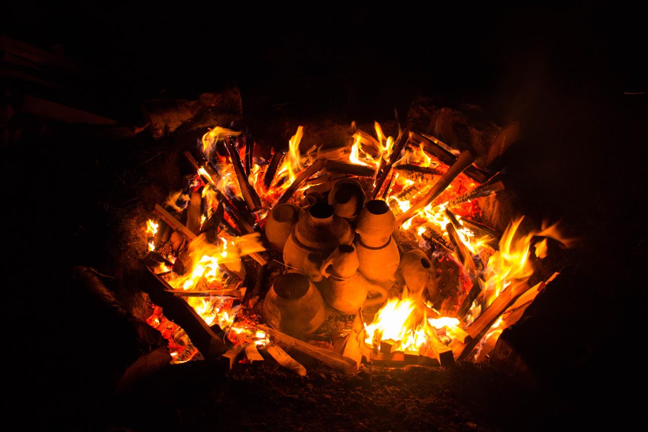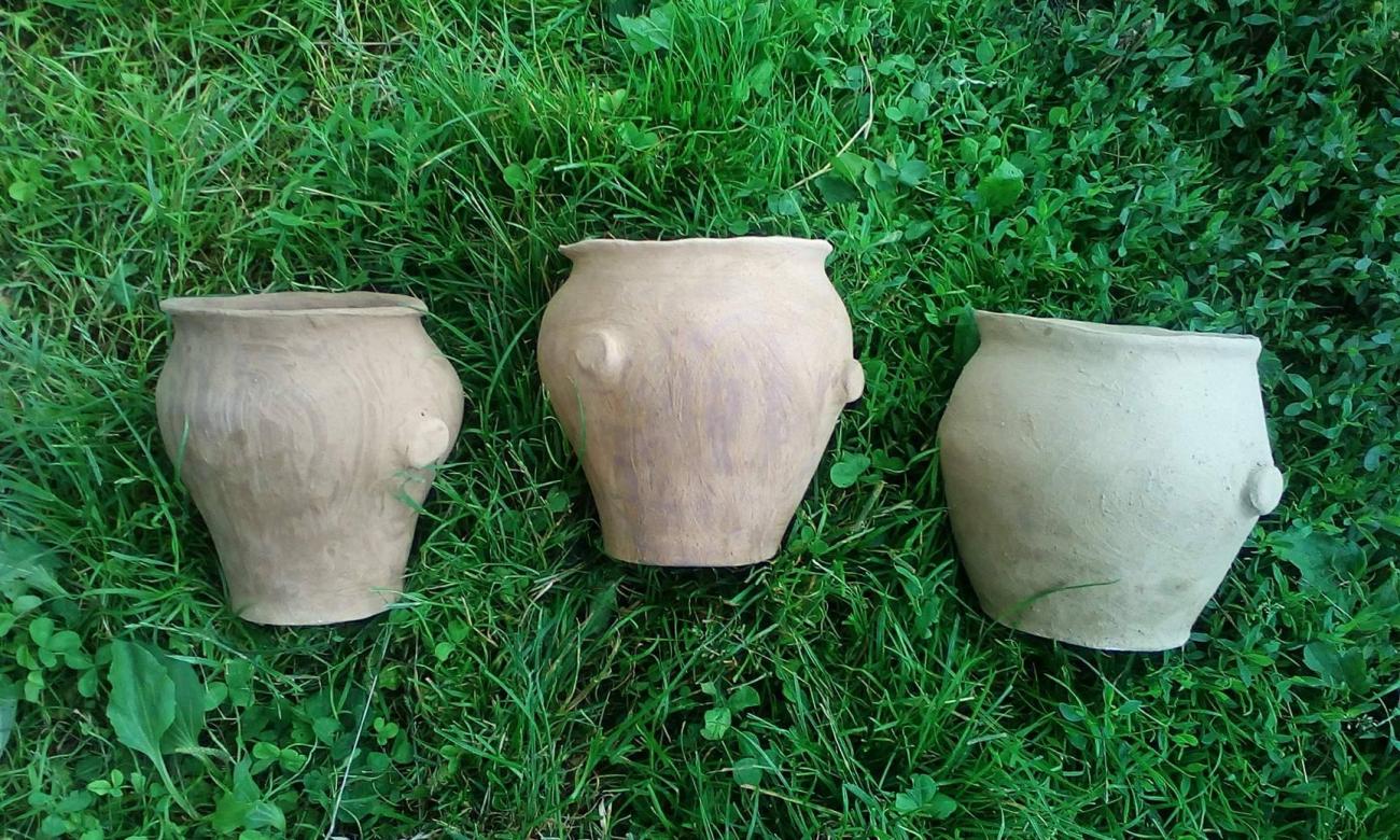Three clay pots, replicas of cooking pots discovered in the Dacian fortification from Mala Kopanya (Zakarpatia, Ukraine), (Kotigoroško, 2014, fig. 75/9) were made at the same time. The working time for each vessel was six hours. After 10 days, when the pots were naturally dried (see Figure 3), they were fired together with other pots in an open fireplace for six hours after a preheating operation (See Figure 4). After burning, one of the three pots cracked and could not be used. The other two pots were in good condition and suitable for use (See Figure 5).