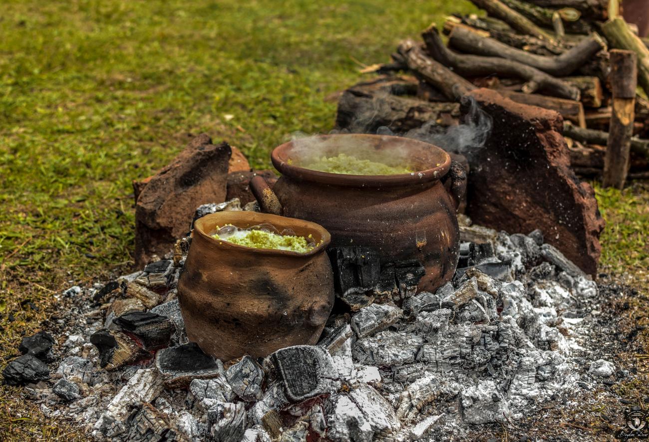 The third stage of the project consisted of home testing the recipe. In the first test a regular clay pot and a grate were used. Attention was focused more on the taste and not on the timing required for cooking. After making the first test (See Figure 6), we decided that some changes had to be made to the recipe: millet food should be served more liquid, much more sauce was needed for each portion, for herbs sauce it would be better to use seasonal ingredients and it would be preferable to use a mead vinegar instead of wine vinegar. At the taste level it was also noticed that the sauce complemented the millet porridge and sausages very well. A second test was made using one of the pots made for the experiment and the grate for the sausage. With the additions made, the recipe was much tastier. It was also noted that for cooking it takes 90 minutes to prepare the ingredients (for making sausages and the green herbs sauce) and another 90 minutes to boil the milk with millet in the handmade cooking pot. Having a little experience and confidence the members of the project decided that the clay pots, the firedogs with the grate and the recipe were ready to be tested during the festival.