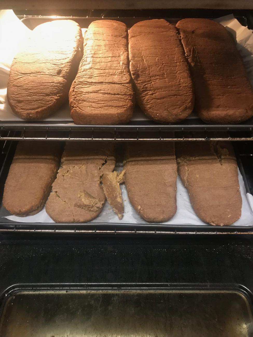 The re-creation of the baking process itself was particularly difficult: with the need to keep the temperature of the oven low (lower than 40oC so that the sourdough culture would remain alive and that the enzymatic process would begin), and the incapability of many modern ovens to go below 79.44oC (175oF), our method necessitated heating the oven to that minimum temperature, and switching it off as soon as the oven reached it. We then let the oven decrease in temperature for 30 minutes before raising the temperature to 79.44oC (175oF) again. The loaves were baked on baking sheets, their position on the racks was changed every hour, they were flipped over after the first eight hours, flipped again after 11 hours, and then flipped every two hours for another seven (See Figure 2). After 18 hours, at the end of the baking process, the bread was baked sufficiently; the enzymes, central to the fermentation process in the absence of yeast had already begun to do their work.