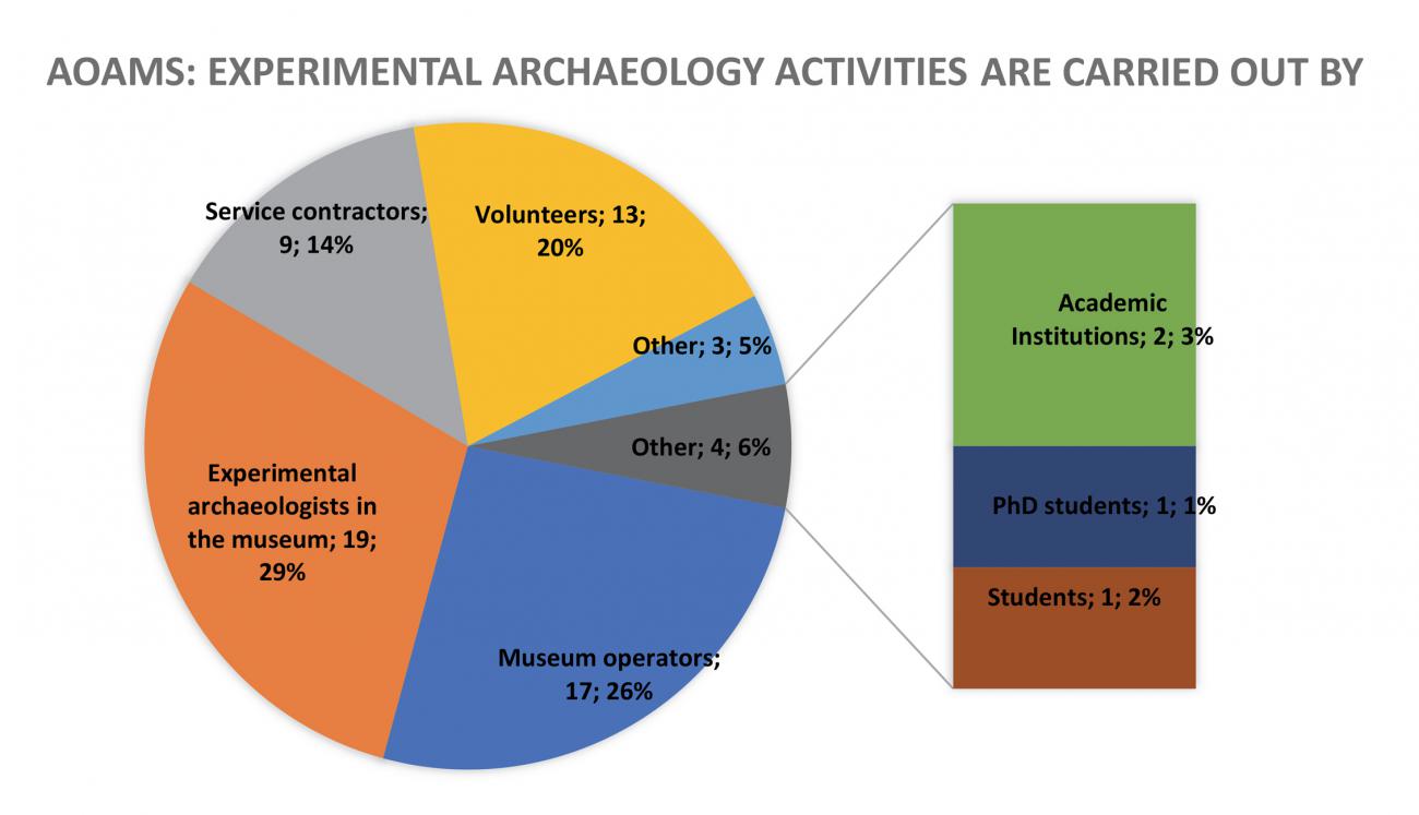 When we move forward to analyse who on the AOAM’s premises carries out experimental archaeology activities (See Figure 3), the HR segmentation shows the majority as part of the internal staff of the museum. The services provided by external professionals are rather contained and volunteers are more attested. Of the “other” human resources engaged in experimental archaeology activities within AOAMs, it was interesting to see that in 4 cases (6% of the total) it was felt necessary to specify that experimental archaeology activities were performed by academics or directly with archaeological academic institutes.