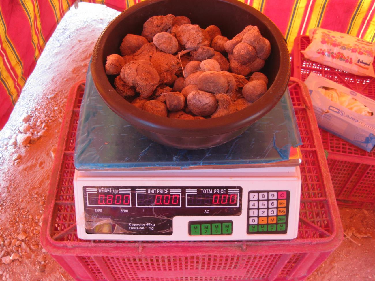 Large individual pieces of camel dung measured 7 cm x 5 cm, the weight of 6 pieces was 0.175 kg. Smaller pieces measured 3cm x 2 cm, the weight of 6 pieces was 0.020 kg. Large slabs of sheep dung were broken into pieces of average size 5 cm x 7 cm x 3 cm.
