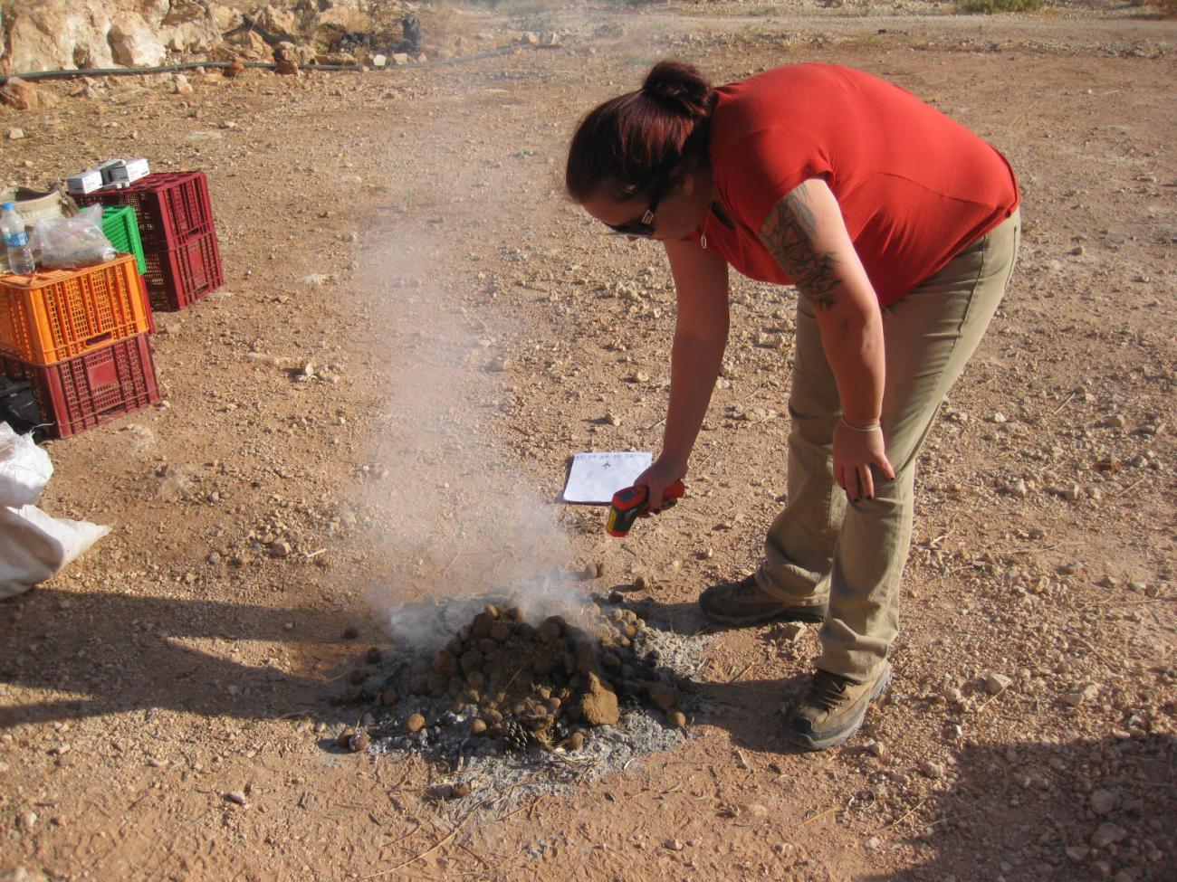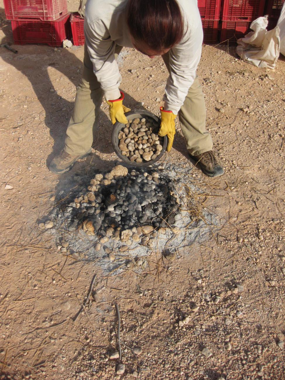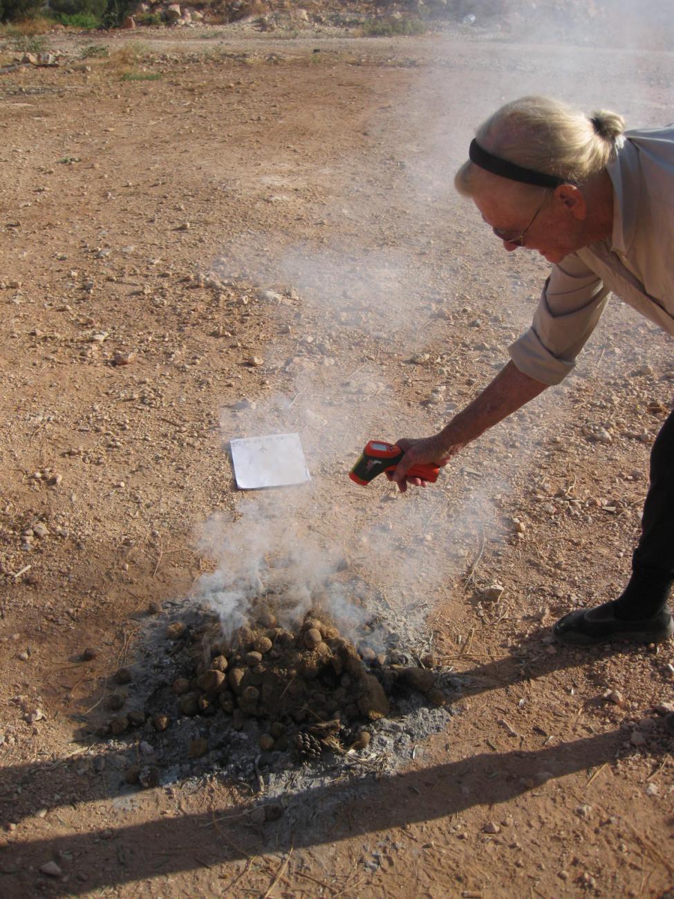 The primary question here is whether camel dung fuel, a previously unstudied waste product for this purpose, can achieve temperatures to harden clay vessels in a bonfiring setting. Once we achieved successful firings with only camel dung fuel we explored the effect of adding small amounts of sheep dung in some firings. This step was included because sheep dung was available as fuel in antiquity and we has an opportunity to discuss details of sheep dung with Bedouin ladies.