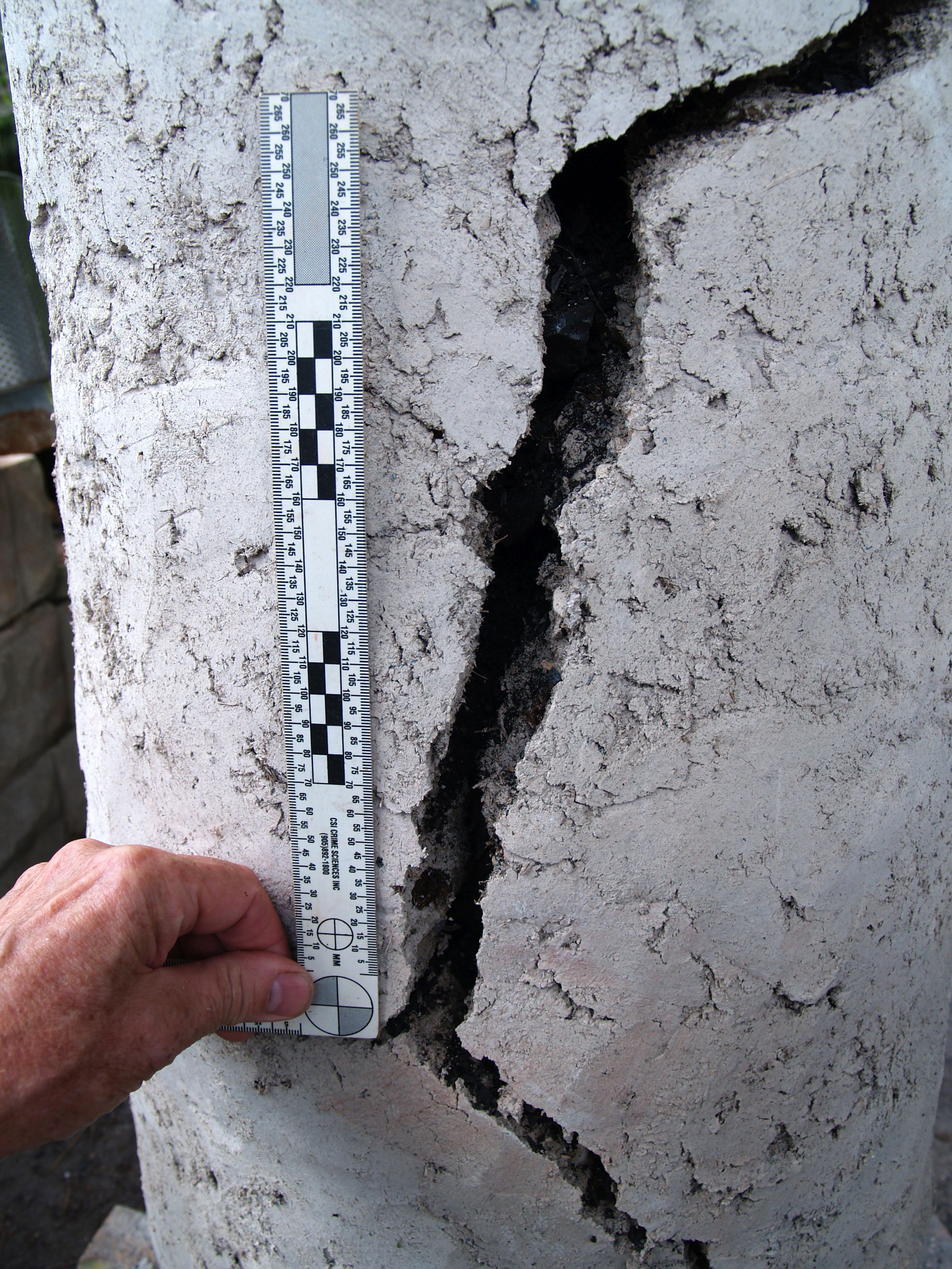 Unfortunately, the original plan had been to perform a burn that same day, but the build process took longer than estimated, and the burn needed to be postponed. As a result, a month passed before the furnace could be checked and a small mistake was identified. Usually, the packing is left in for a couple of days, then removed allowing the structure to finish drying. That step was omitted here. The problem (which should have been anticipated) with failing to empty the furnace is that the interior mix acts as a solid form. As the clay dries from "wet" through "leather hard" to dry it shrinks - typically 10-15%. Since the furnace could not contract against the packing materials, the walls cracked. In this case, it was a spiral crack through the weakest points, passing from just above the base, running diagonally through the lower working port, and extending beyond it.
