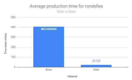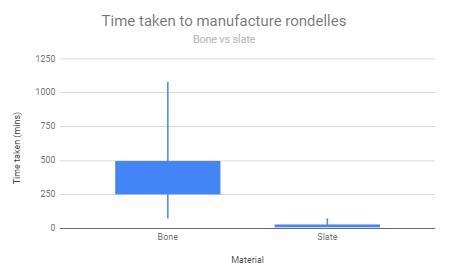 The experiments revealed that the production of rondelles using slate can be very rapid when compared to bone, regardless of the method used in the case of the latter. Even with a smaller sample population; the average and range (See Figures 13 and 14) are significantly different. However, as the slate method used was destructive in releasing the rondelle blank, more rondelles could be produced from a similar quantity of material when working bone compared with slate. One factor could be the skill level of the researchers; slate is soft and easy to work with stone tools, suggesting that even unskilled working can produce a rondelle quickly, whereas the manufacture of bone rondelles produced a wide spread of times as low as 74 mins and as high as 1080, suggesting the working of bone was more sensitive to experience and technique. With greater experience, slate rondelles might have been spaced differently on the block, designed so as to minimise wastage when the block was broken the release the blanks, which may change the relationship between efficiency and the material used to make the rondelle blank.