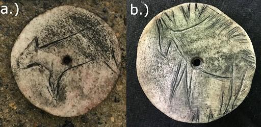 Rondelles are frequently perforated, with 2 mm - 3 mm diameter holes being common. Multiple permutations are known, with a variant displaying several perforations close to the outer edge being especially common, as well as a variant displaying a single perforation to the centre of the cut-out (Bellier et al., 1991, p.17), possibly suggesting suspension was important in their subsequent use. Rondelles are typically engraved, in some cases only on a single face, while in other examples on both faces, and a wide range of designs have been reported. For example, Sieveking (1971) has noted a number of geometric designs, including a âtype Aâ motif, with lines emanating from a central perforation; a âtype Bâ motif, with lines emanating from a circled edge, as well as denticulated edges; and also âbarbed lineâ designs. The depiction of animals in naturalistic detail is also common, perhaps best exemplified by the rondelle recovered from Laugerie-Basse (AzĂ©ma and RivĂšre, 2012, pp.320-323) where a young chamois was drawn in different postures on each face of the rondelle. While engraving may have been simply decorative in some cases, in others it may have been an integral part of the function, and therefore an important consideration when thinking about both the meaning of rondelles and how they were used.