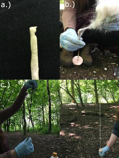 Following MÄrtensson et al., (2006) experimental observation that spindle whorls can be effective at spinning yarn at weights as low as 4-18 g, bespoke rondelles were manufactured weighing 14 g each to facilitate their testing as spindle whorls. To test the ability of the rondelles to spin textiles, three fibres were chosen: dog (Canis familiaris) fur (5 g), sheep (Ovis aries) wool (5 g) and natural roving (pre-spun wool) (2 g). A 100 mm section of horse chestnut wood was carved to fit the central perforation and a 5 mm notch was added to the top to act as a hook to catch the fibres. Two experiments were conducted, one rondelle spinning roving and dog fur and the second roving and sheep wool. The wool and fur were separated into strands and any dirt removed beforehand. The fibres were then drafted into strands and the spindles dropped to spin the yarn; if after five attempts there was no success then the experiment was ended (See Figure 11a-d).