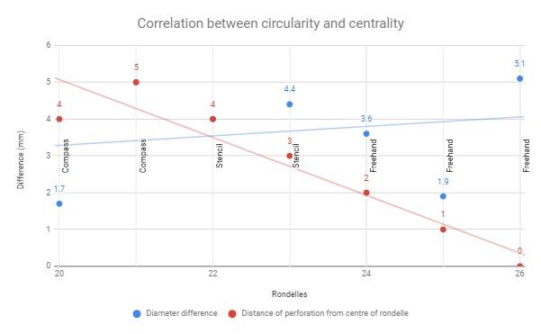 Once a rondelle blank has been produced, there are a number of variables that can be manipulated, many of which might relate to function. These variables include size and roundness, with grinding being a uniformly effective means of controlling the final size, shape, and weight of the rondelle, regardless of the material used, as well as the location, size and number of perforations. There was no correlation between the technique used and the circularity of the finished result across all experiments. The production methods also failed to correlate circularity with the centrality of the perforation. For example, whilst rondelle 26 showed the maximum difference in diameter, there was no deviation from the true centre with the perforation. The âcompass methodâ showed no significant advantage over freehand in a comparison of circularity, with a difference of 1.7 mm and 1.9 mm respectively.